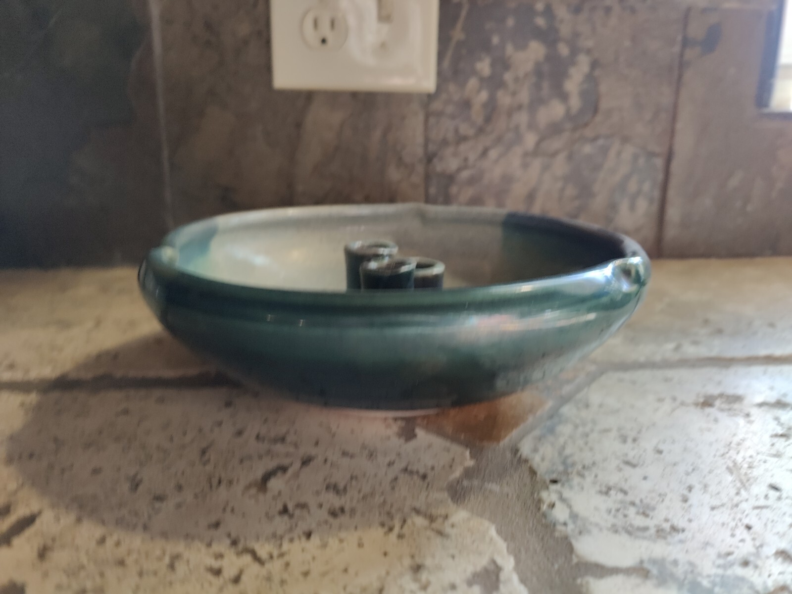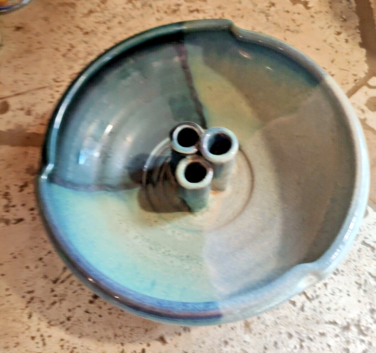 Add a touch of elegance to your home decor with this beautiful Turquoise Blue Pottery Flower Frog Bowl. The bowl features a stunning multicolor design, handcrafted from high-quality clay using the pottery technique. Measuring 8 inches in width, it is the perfect size to display on a tabletop or shelf.