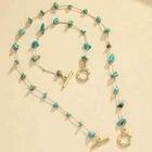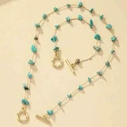 This beautiful jewelry set features a stunning combination of gold tone metal and faux turquoise blue chip stones in an irregular shape. The set includes a necklace and bracelet, perfect for all occasions such as weddings, parties, or casual wear. The pieces are handmade and nickel-free, ensuring quality and safety for the wearer. The bohemian and ethnic themes of this set make it a perfect addition to any fashion and costume collection. The necklace is 15.78 Inches and Bracelet is 6.69 Inches Get ready to make a statement with this unique and beautiful Turquoise Chip Necklace Bracelet Set. (H)