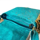 Description: Make a bold statement with this handcrafted turquoise cowhide shoulder bag, designed to blend bohemian charm with luxury details. Its striking golden medallion centerpiece, intricate beadwork, and long fringe accents create a show-stopping design that stands out anywhere you go. Crafted from high-quality natural cowhide, the bag is not only durable but also soft to the touch, offering both style and practicality. With limited quantities available, each bag is unique and exclusive, making it a one-of-a-kind accessory for your collection. Perfect for daily wear or special occasions, this bag pairs effortlessly with casual outfits or boho-inspired looks. Whether you’re heading to a festival, a night out, or simply want to elevate your everyday style, this turquoise cowhide bag is the perfect companion. Specifications: Dimensions: 12" W x 10" H x 4" D Material: Premium natural cowhide with leather accents Color: Turquoise with golden medallion and fringe details Strap: Comfortable adjustable shoulder strap Closure: Secure flap with interior zipper compartment Design: Golden medallion centerpiece with beadwork and fringe trim Limited Edition: Available in small quantities Key Features: ✔️ Handmade from high-quality cowhide ✔️ Striking turquoise hue with golden medallion centerpiece ✔️ Luxurious fringe detailing for a bold boho style ✔️ Spacious interior with a zipper compartment for essentials ✔️ Limited edition, truly unique piece Condition: · Brand New