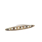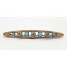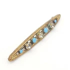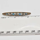 Wonderful, small antique bar pin. The pale goldtone brooch has clear rhinestones and turquoise blue enamel accents. It has a C Clasp and is unsigned. It is in nice, antique condition and shows some tarnish and plating wear mainly to the back side. There is also a small amount of verdigris. Size: 2 1/4"W x 1/4"h