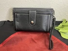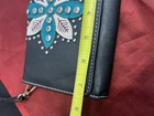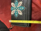 This Montana West studded leather clutch/wallet is a must-have for any fashion-forward woman. The turquoise design and blue hardware add a pop of color to any outfit, while the faux leather handle/strap adds a touch of sophistication. The bag measures 5 inches in width, 8 inches in height, and 2 inches in depth, making it a small but practical size for everyday use. The interior is lined with black fabric and features credit card slots and inner dividers for easy organization. The bag is part of the American Bling product line and is perfect for anyone looking for a designer accessory. Whether you're running errands or going out for a night on the town, this wallet is sure to impress. Preowned bag and excellent condition.