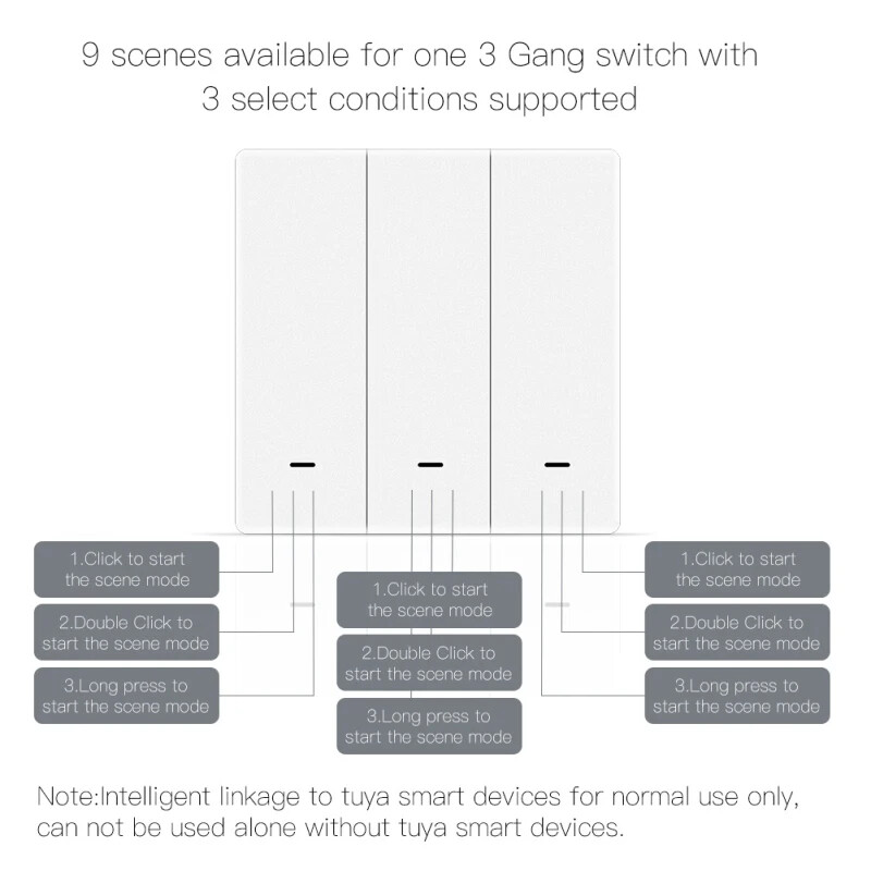 Tuya ZigBee 1-3 Gang Wireless Scene Switch Push Button Controller Battery Powered Automation Scenario Tuya Devices products Description: Note:Intelligent linkage to Tuya smart devices normal use only,can not be used alone without Tuya smart devices. Note:ZigBee hub required adding switch to it normal use. 1.Smart automate Tuya ZigBee wireless scene switch to any Tuya smart devices in Smart Life App to set various scenes for your smart life.Tap-to-run to get another easier control for all Tuya smart devices with key the switch.Each switch button can satisfy needs, realizing different scenes.Imagine the smart linkage to create an infinite space with the wire scene switch. Note:ZigBee hub required for adding the switch to it for normal use. 2.Three pairing modes for each button to achieve 9 scenes from 3 gang scene switch,such as away mode,home mode,movie mode,etc.To create any smart automation as you want your smart phone app to start your another intelligent lifestyle,no more voice command needed,no more time to open your app,only touch required,when you are tired from - work. 3.Compact magnetic design with transmitter switch feature: it is a wireless wall switch when attached to the wall, remote control when unattached. More importantly,it is featured as a transmitter switch paired to a smart switch in app for controlling your house lights with your master smart switch together. It can be conveniently carried to the balcony, bedroom, kitchen, and more due to its compact size. 4.It can be used in numerous scenes with smart devices: speed up smart device responding time, provide more fluid control, remove the dependence a WiFi network only. 5.Fix it anywhere you like with double-side ;Low power consumption with long battery life;no wiring needed for simple use,easily establish control to realize fast and easy upgrades. New product upgrade, not only can control the scene switch, but also can control a single product Specifications: Input:CR2430 3V Dimension:86*86*13mm Package Included: Wireless scene switch*1 Manual*1 Sticker*2