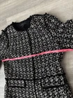 **I have a matching skirt but it’s size 8, check out in my storefront** This Tweed Blazer by Ann Taylor is a classic and preppy addition to any woman's wardrobe. It features a check pattern with fringe accents, a hook & eye closure, and a short length with long sleeves. The black, white, and pink color scheme makes it versatile for various occasions including formal, business, and casual wear. The polyester lining and machine washable fabric ensure easy care and durability. Perfect for a teacher, office worker, or academic looking to add a touch of sophistication to their outfit.