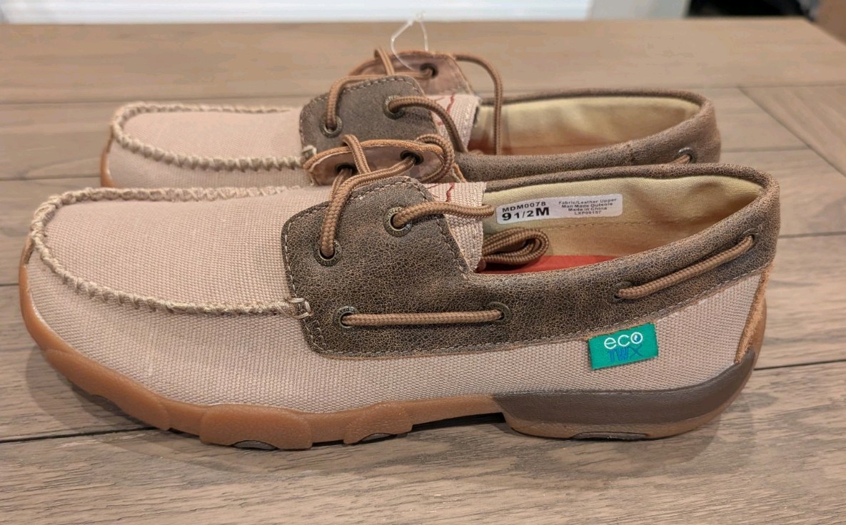 The Twisted X ECO MDM0078 Men's Boat Moccasin Shoes are a stylish and comfortable option for casual wear. With a solid beige/khaki color and lace-up closure, these shoes feature a unique moc toe design and are made with moisture-wicking leather and a cushioned foam insole for added comfort. The outsole is made of rubber for slip resistance, making them suitable for various activities. TWISTED X is known for their quality craftsmanship and attention to detail, making these boat moccasin shoes a great choice for any man's wardrobe. (C-502)