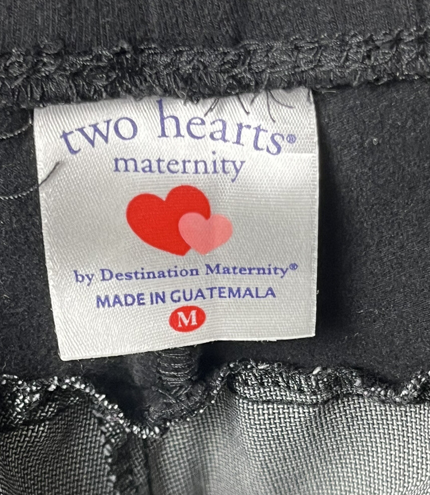 Two Hearts Maternity by Destination Maternity Pants Wide Leg Black and Gray Expandable Stretch Waist Buckles Faux Back Pockets Women's Maternity Medium Waist at top 32 Rise 13.5 Inseam 31 Hips 42 Stomach Band Length 8.5 inches. Stretch Breathable Band material cotton spandex Pants Cotton polyester rayon spandex. Machine Washable