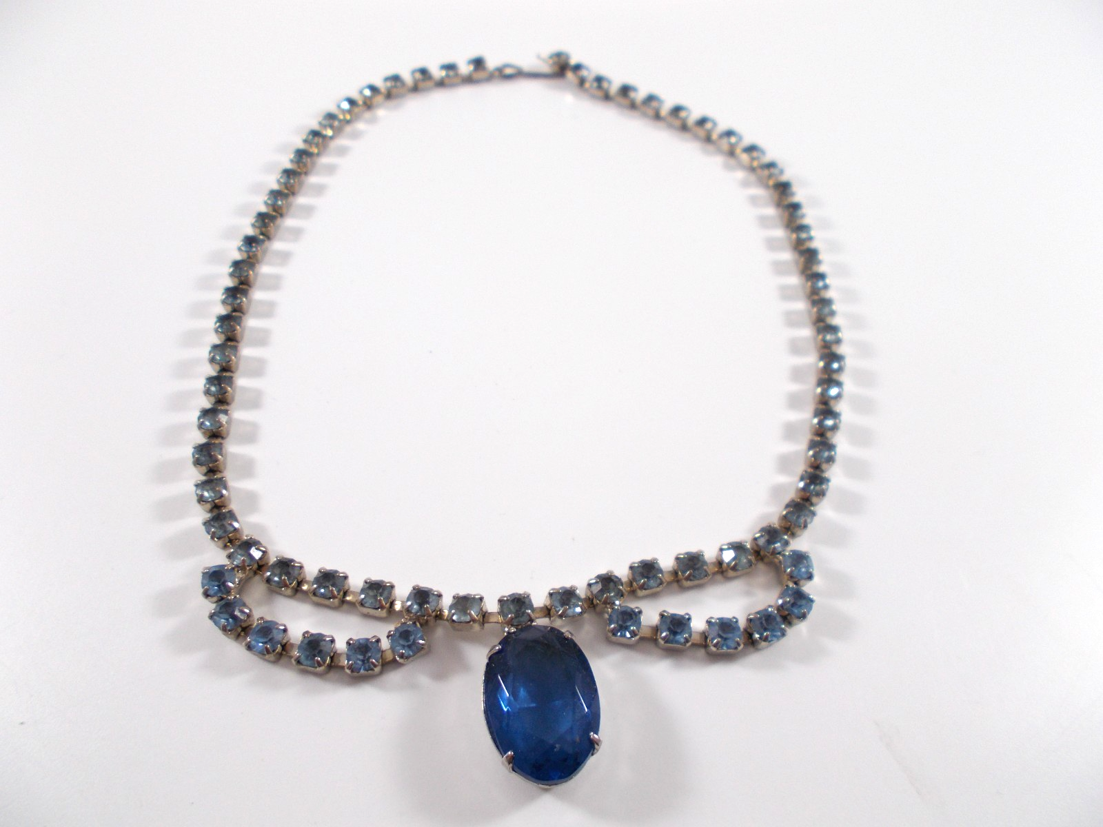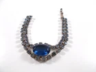 This lovely blue rhinestone set includes a 14" necklace with a hook clasp, a 6" bracelet with a fold over clasp and clip on earrings. the set is unsigned so origin is unknown. Each piece has a 5/8" royal blue faceted oval glass, prong set stone. The necklace has two light blue rhinestone swags in front bordering the large blue drop and a chain made of light blue rhinestones. The bracelet has a double row of light blue rhinestones that border the top and bottom of the large blue stone. The earrings are 1" high with large blue stone accented on the top and bottom with two light blue rhinestones. The pieces have bright silver back finish and all stones are prong set. Gift boxed. Combined shipping is available. $5.00 for first item purchased with USPS Ground Advantage. Plus $1.00 for each additional item purchased at the same time. To combine shipping on items that have different shipping cost methods (flat rate, shipping included, calculated shipping), exact weight of package will calculated and excess shipping will be refunded.
