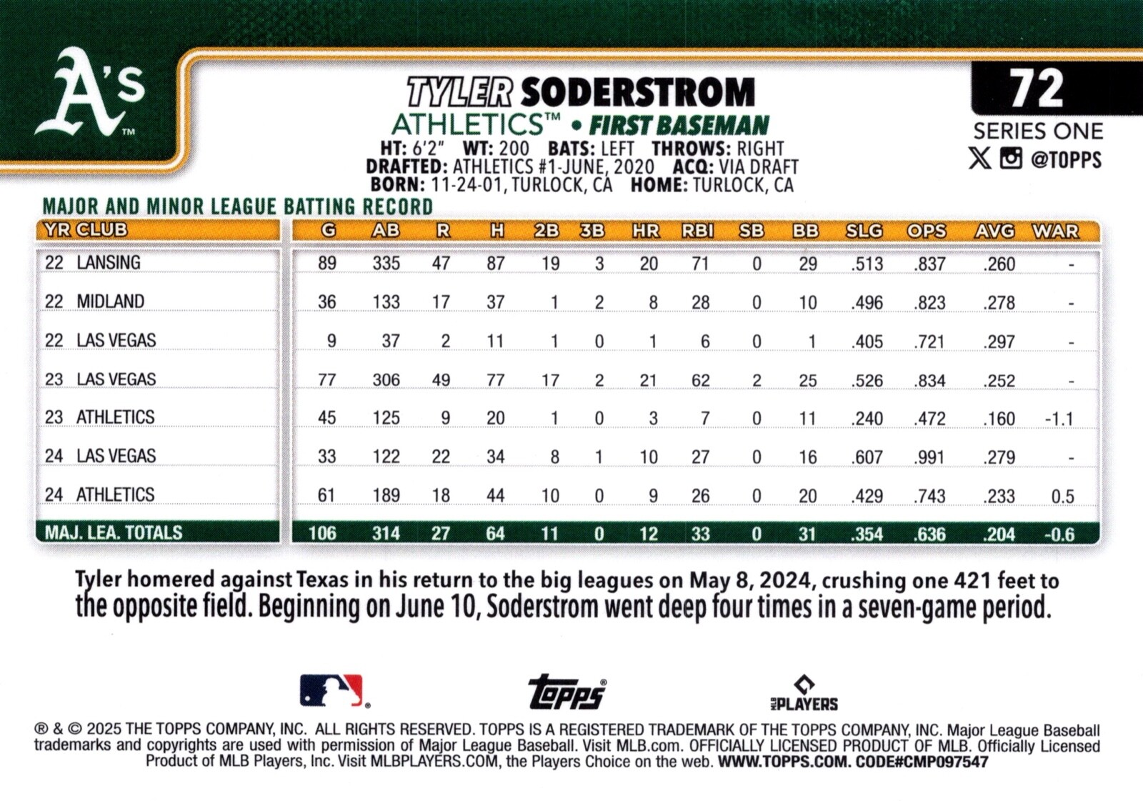 Event/Tournament:MLB World SeriesSport:BaseballMaterial:Card StockSeason:2025Year Manufactured:2025League:Major League (MLB)Set:2025 Topps Series 1Type:Sports Trading CardVintage:NoGraded:NoCard Size:StandardFeatures:InsertOriginal/Licensed Reprint:OriginalLanguage:EnglishCountry/Region of Manufacture:United StatesAutographed:NoTeam:Oakland AthleticsPlayer/Athlete:Tyler SoderstromManufacturer:Topps
