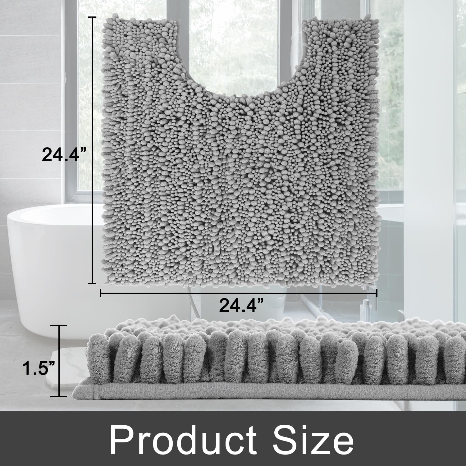 The luxury shaggy U-shaped toilet rug is the perfect addition to your bathroom accessories collection. Made of 100% ultra-soft microfiber, this contour mat is not only comfortable and supportive on your feet, but also highly absorbent and quick to dry. Its hot melt adhesive backing provides an anti-slip surface, making it a safer option for your bathroom. With various color options, this toilet rug can go with and decorate different home styles, making it a versatile bathroom accessory. Plus, it's easy to clean - simply toss it in the washing machine and tumble dry low. Its thick and well-constructed chenille material provides a cloud-like feeling underfoot, making it a must-have among bathroom accessories. Choose your favorite color and bring the clouds home with luxury chenille bathroom mats. Ultimate Cloud-Like Soft Comfort: Experience walking on clouds with our extra thick chenille bathroom mat! The ultra plush high pile density cradles your feet, banishing cold tiles after showers. It is perfect for adding warmth to any bathroom floor, transforming routine steps into luxury moments Massive Water Absorption in Seconds: 5X faster than other materials mats, bath mat absorbs 1000ml of water in 3 seconds. The vertical fiber channels lock moisture away from the surface, keeping your bathroom floor dry and discouraging damp environments. Perfect as a shower exit guard or sink splash catcher Total Grip Safety & Quick Dry: bath rug features a feather-light yet ultra-grippy hot-melt backing that stays firmly in place on wet surfaces. Its vertical air-channel chenille fibers ensure rapid and complete dryness, providing instant dry safety the moment you step out of the shower. The product is tested for harmful substances, performance, longevity, and emissions in accordance with the OEKO-TEX Standard 100 Fade-resistant & Easy Care: Crafted with a flexible hot-melt adhesive layer, our shower rug withstands over 100 rigorous machine washes without cracking—unlike brittle TPR, which deteriorates after just 10 cycles. It retains vibrant colors wash after wash,while the plush pile rebounds effortlessly, maintaining "Day 1" freshness. Simply toss it in the washer weekly—no hassle, no fading, no worries Multi-Scene Versatility: bath rugs offer full-scene adaptability, with 20+ colors and 10 sizes designed to complement any bathroom decor. Choose space saving rugs for small areas to cover sink wet zones, oversized rugs for large bathrooms offering full-area protection from bathtubs to vanities, while contour rug designs frame toilets. These rugs also serve as decorations: muted tones create spa calm, while bold colors like Coral energize kids' baths