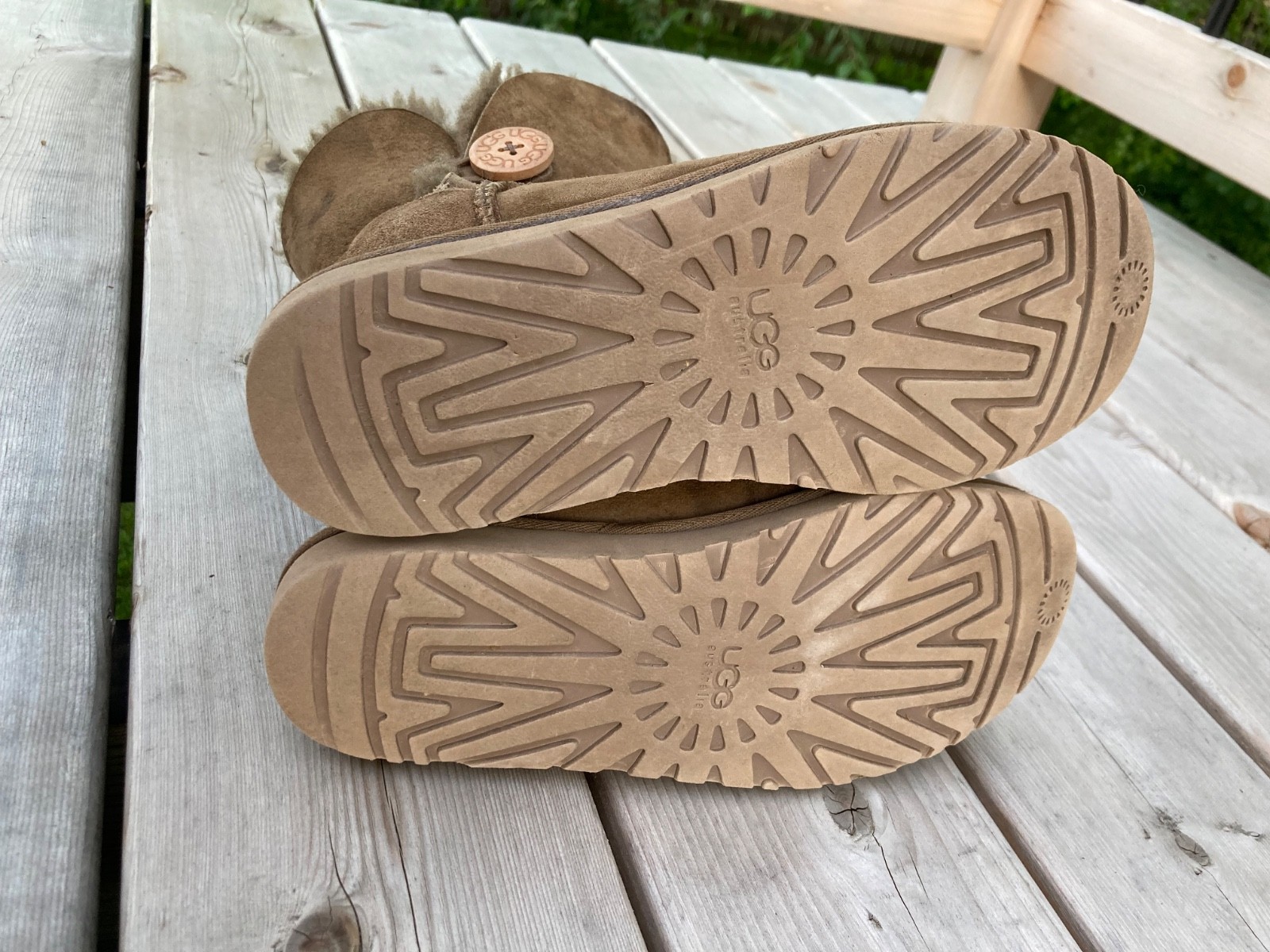 The UGG Australia Sheepskin Chestnut Mini Bailey Buttons Boots are a stylish and comfortable choice for women in size EU 38 (US 7). These round toe, button closure boots feature a low heel and sheepskin lining for added comfort. The solid brown color and button accents give these booties a trendy and versatile look, perfect for outdoor occasions. Made by the renowned brand UGG Australia, these shoes are a must-have for any fashion-forward woman looking to stay cozy and chic. Cute worn in condition, lots of wear left in these!