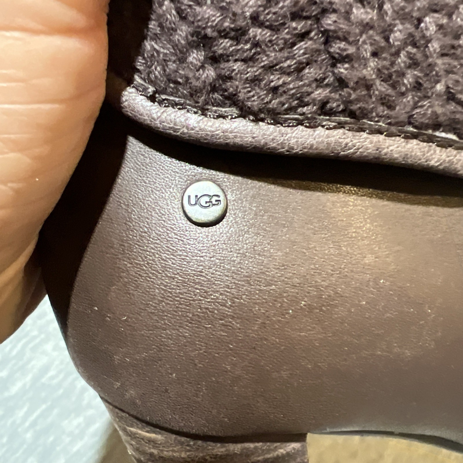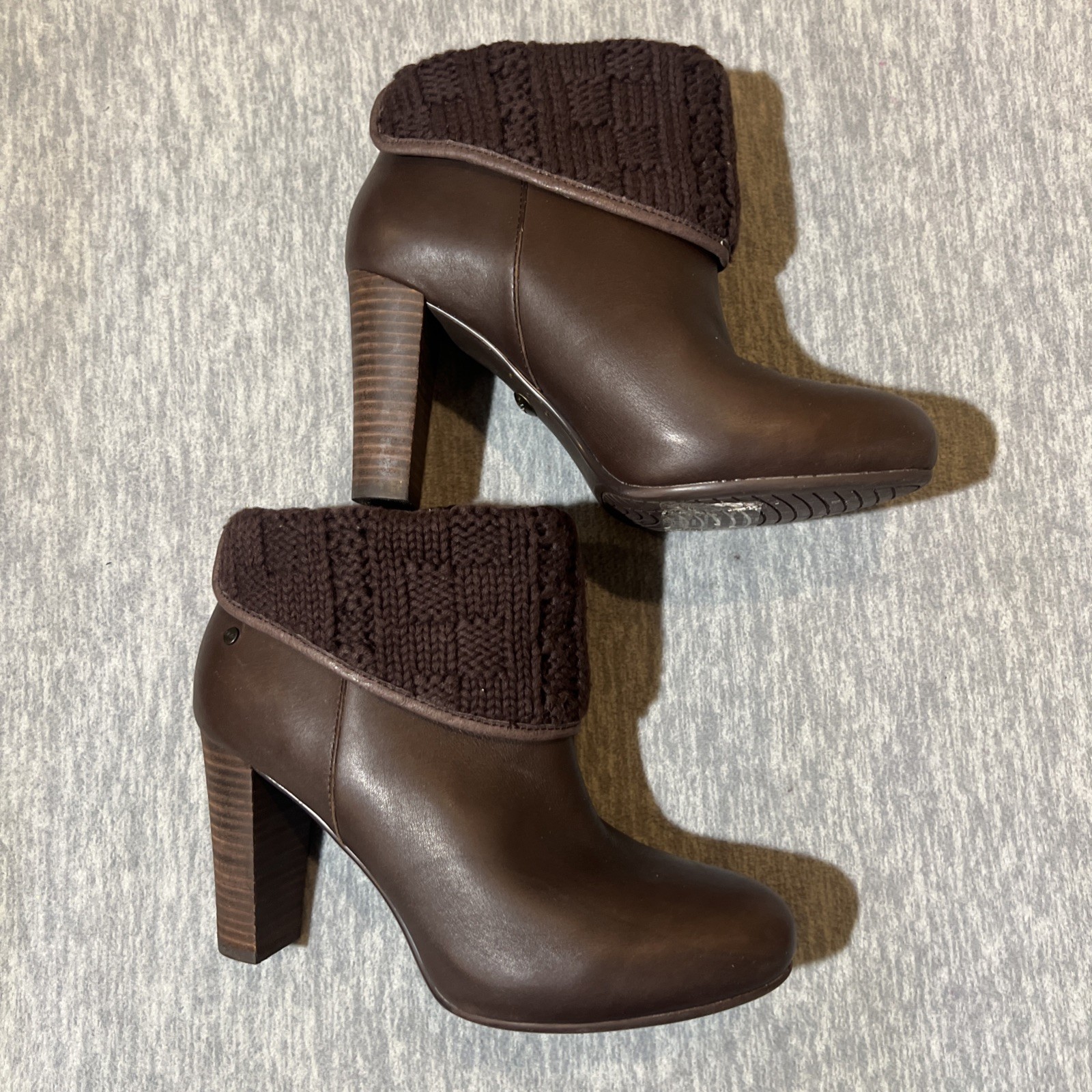 The UGG Australia Dandylion Tres Cuff Block Heel Bootie in size 6.5 is a stylish and versatile boot designed for women. Made with high-quality leather and lined with wool, these ankle boots feature a round toe shape, high block heel, and a unique sweater cuff accent. Perfect for various occasions such as travel, parties, casual outings, and business meetings, these boots are a fashionable choice for the fall, winter, and spring seasons. The brown leather and wool materials add a touch of classic and feminine style to any outfit, making them a must-have in any woman's shoe collection. In EUC. Bottoms look new- appear to have been lightly worn. See all photos before purchasing