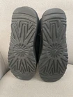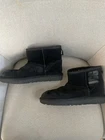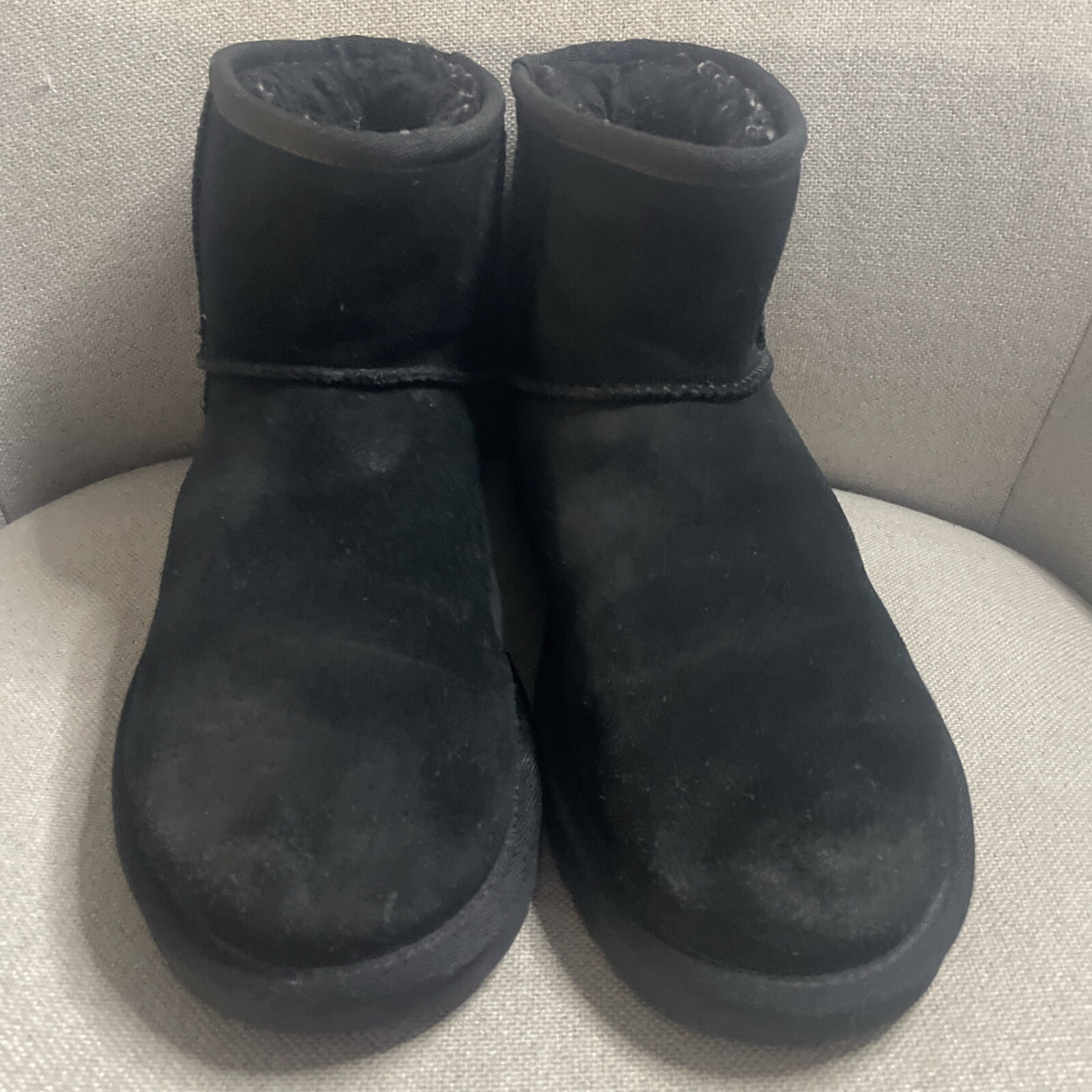 These UGG Classic Mini boots are designed for women in size 7 (UK size 5, EU size 38) with a round toe shape and a low wedge heel. The black suede upper is accented with a rubber logo and lined with cozy shearling, providing comfort and warmth. Featuring a pull-on closure and ankle shaft style, these boots are suitable for various occasions like travel, parties, work, or casual wear. The rubber outsole offers durability, making them versatile for winter, summer, fall, and spring seasons.
