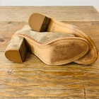 Suede Rear zipper Leather lining Leather-wrapped foam insole Rubber outsole 3" heel height Good condition