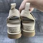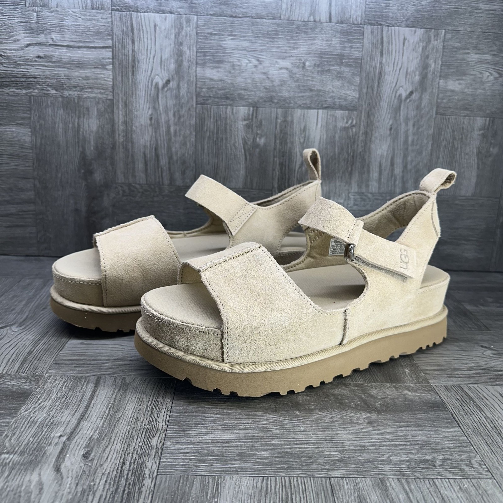 The UGG GoldenStar Hi Platform Women's size 11 Suede Sandals are stylish and comfortable slingback sandals perfect for casual occasions during the summer and spring seasons. Made with a suede upper material, rubber outsole, and fabric lining, these sandals feature a solid tan color with the UGG logo as accents. With a platform height, they provide added comfort for all-day wear. The US size 11 and UK size 9 make them a perfect fit for women looking for a fashionable and practical shoe option.