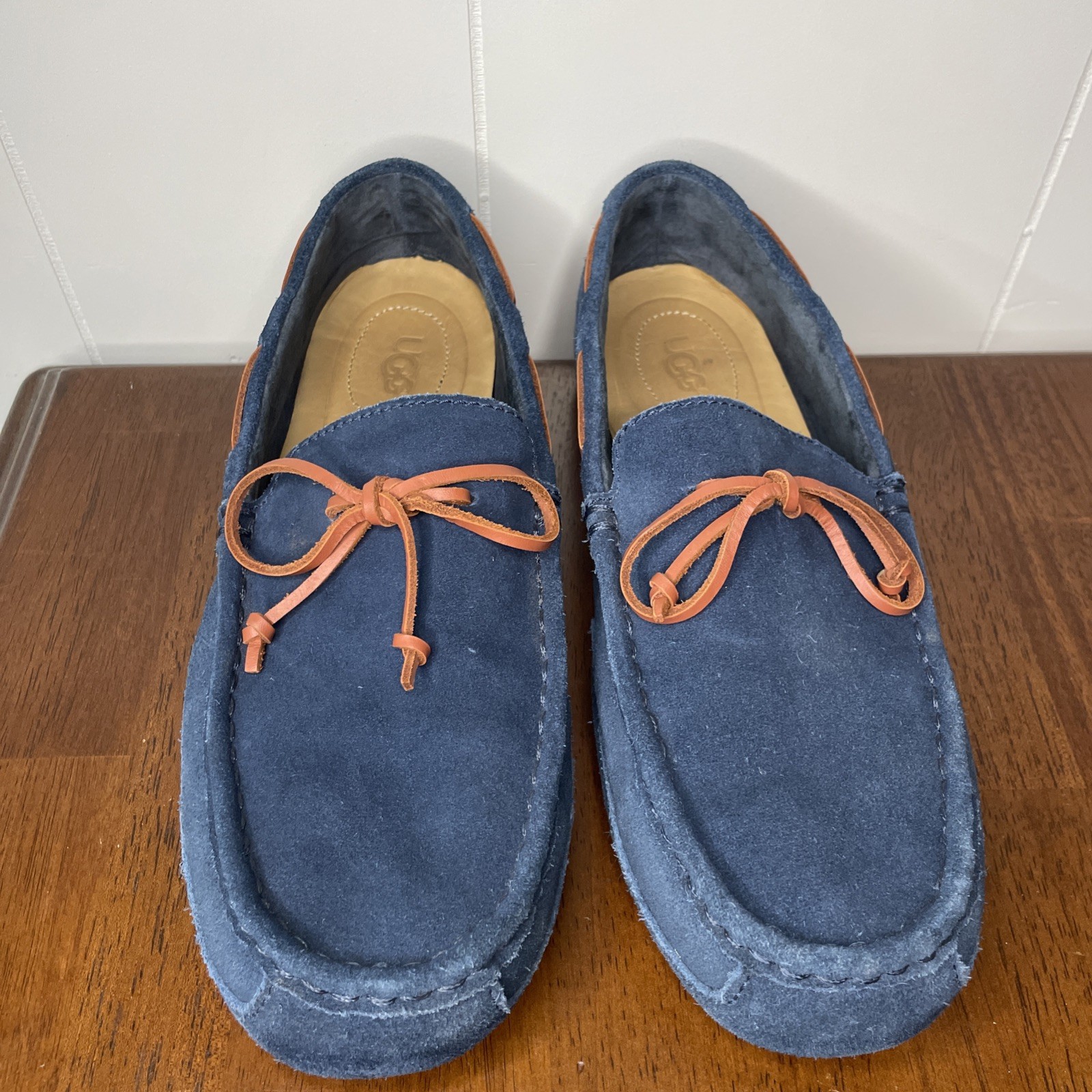 These UGG blue suede slip on loafer are in excellent condition with little to no wear. The only flaw I could find on them was the inside sizing rubbed up a little bit. Soles are still in like new condition and outside is very clean. Check out my store for more clothes! All items are packaged with care and consideration. Thank you!!