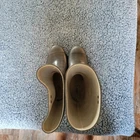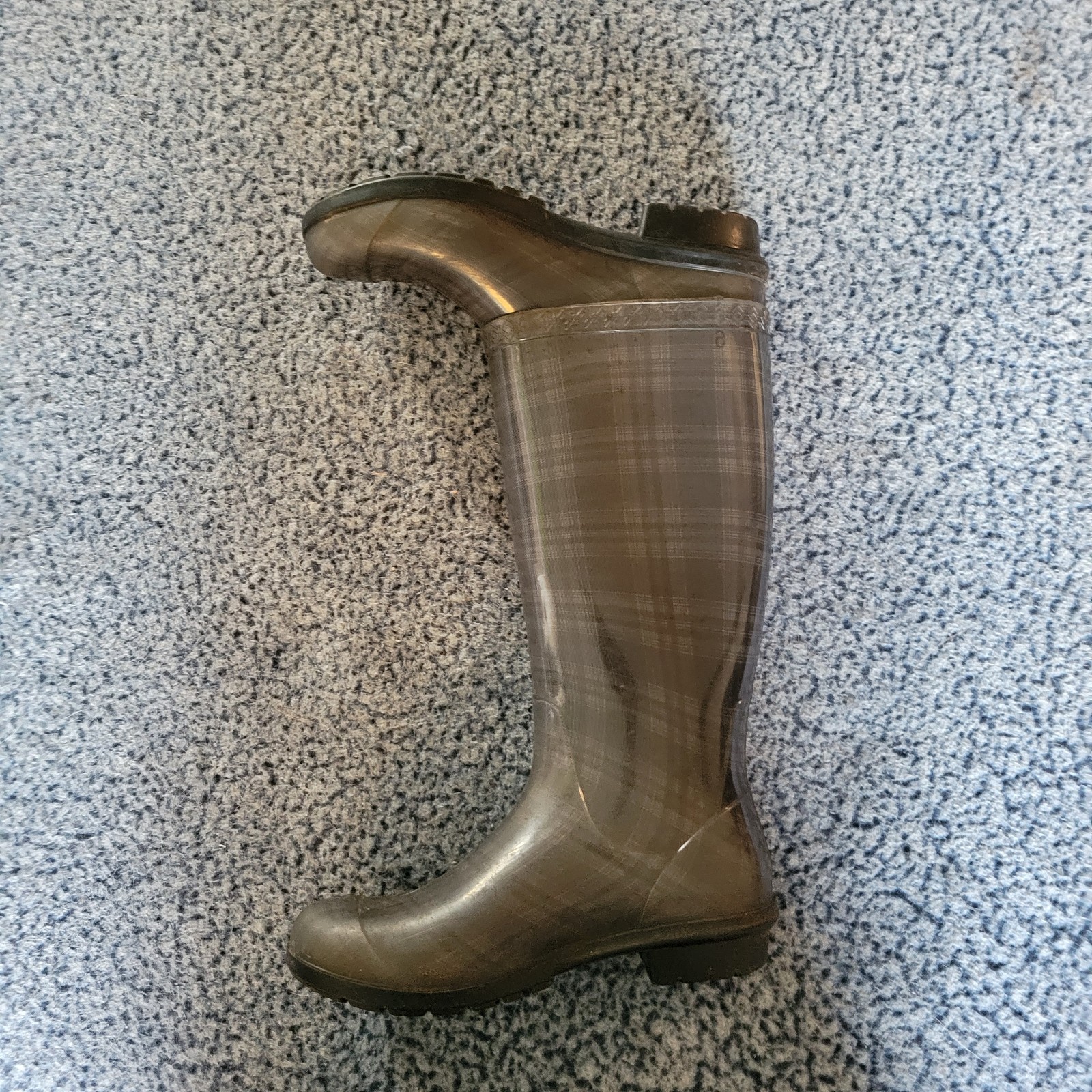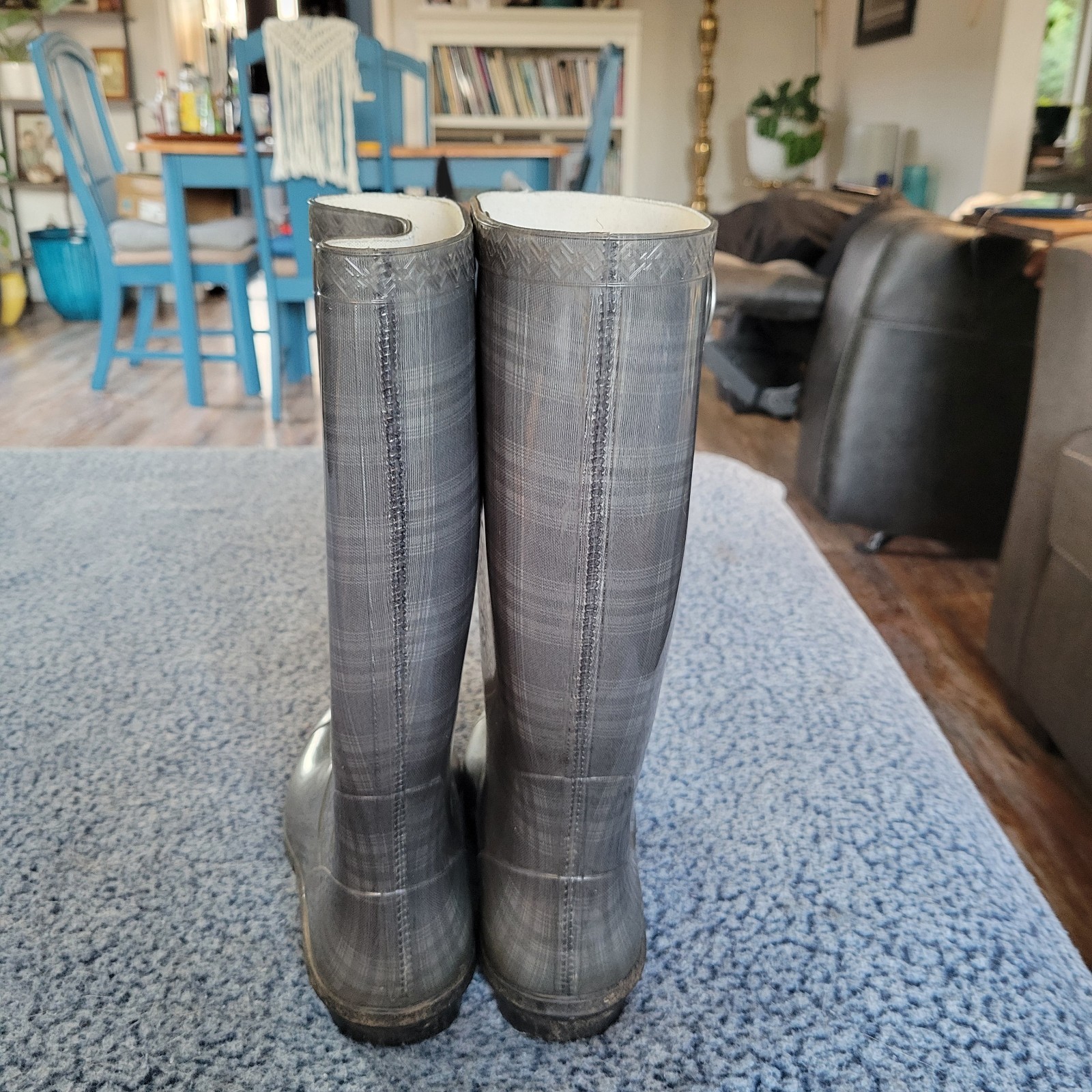 The UGG Plaid Waterproof Rain Boots in Gray, size 6, are a stylish and practical choice for women looking for footwear that can withstand the elements. These knee-high boots feature a round toe shape, low heel height, and a sawtooth block heel for added support. The rubber outsole provides excellent traction, while the wool insole ensures comfortable wear. With a logo design on the outer boot and a stay dry theme, these rain boots from UGG combine fashion and function for a versatile addition to any wardrobe.