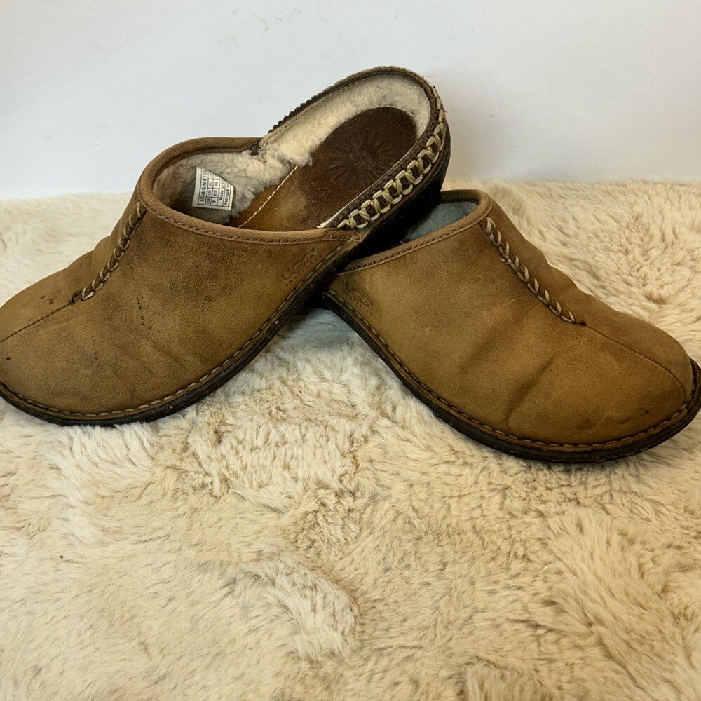 Step into comfort with these UGG Tan Slip-On Loafers, crafted from soft suede for a relaxed fit. The rounded toe and subtle stitching details add a touch of style, while the durable sole ensures lasting wear. Perfect for casual outings or lounging at home, these loafers offer effortless style and comfort. Note spots in pic 1.5