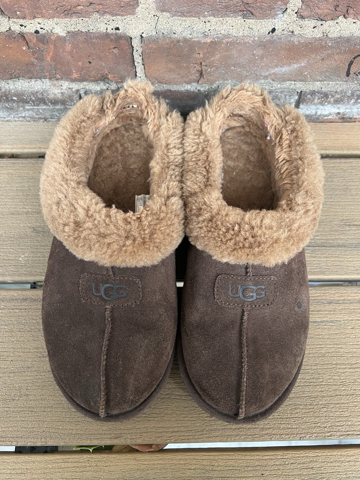 The UGG Tazzette Burnt Cedar Slippers 1134810 are women's winter shoes in a US size 10. These slip-on slippers feature a solid brown color with a closed toe and shearling lining for ultimate comfort and warmth. The low heel height, cushioned insole, and wool insole material make them perfect for casual occasions during the winter season. The shearling fabric type and fur trim accents add a touch of luxury to these UGG slipper shoes, which are designed for ultimate comfort and style. Made with suede upper material and a polyurethane outsole, these UGG Tazzette slippers are a stylish and cozy choice for the colder months.
