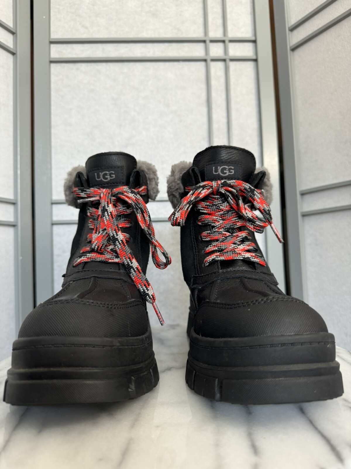 The UGG Women Ashton Addie snow boot in black is designed for outdoor activities with insulation to keep your feet warm. This boot has a UK shoe size of 7, US shoe size of 9, and EU shoe size of 40, with a rubber outsole for traction. Made from waterproof leather, the Ashton model is manufactured in Australia, showcasing UGG's brand quality and style for women who value both fashion and functionality in their footwear. Pre-owned in wonderful condition as pictured