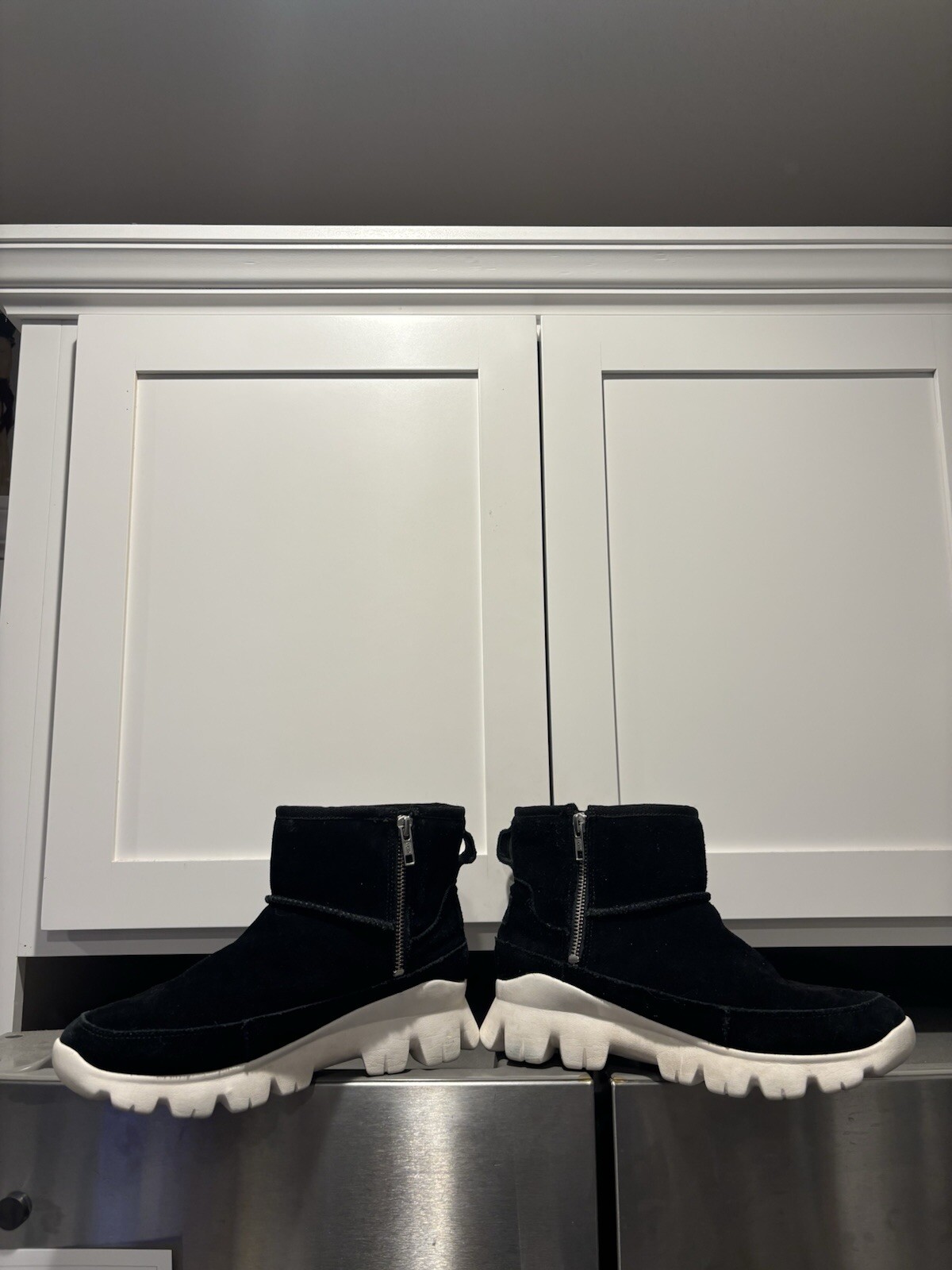 Step into comfort and style with these UGG women's boots. The black suede material and white soles create a chic and timeless look that will complement any outfit. The boots feature a zipper closure for easy wear and a Dry Tech lining to keep your feet dry and comfortable. These shoe boots are perfect for any occasion, whether you're running errands or going out for a night on the town. The UGG brand is known for its quality and comfort, and these boots are no exception. Don't miss out on the opportunity to add these stylish boots to your shoe collection.