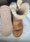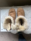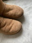 Elevate your style with these classic UGG Cameron Chestnut boots. Designed with a chic mid-calf silhouette and a fashionable round toe, these boots feature a pull-on closure for ease of wear. The bow accent adds a touch of elegance to these boots, making them perfect for casual occasions. Crafted with high-quality suede leather and lined with soft sheepskin, these boots provide ultimate comfort and warmth during the winter season. The flat heel style ensures a comfortable fit, while the wool insole material adds an extra layer of comfort. These boots are perfect for women who want to stay stylish and comfortable at the same time. Good pre-owned condition. See pictures