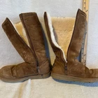 The UGG Women's Classic Short II Suede Fur Boots in Chestnut Brown, Size 6 are a stylish and comfortable choice for casual occasions in the winter and fall seasons. Featuring a round toe shape, pull-on closure with zipper, and a flat heel, these boots offer a cozy lined interior with a shearling fabric type and a fur lining material. The mid-calf shaft style and rubber outsole provide both style and practicality, making them a classic addition to any woman's wardrobe. Preowned. Minimal wear. Little spots that can be cleaned up with a suede brush (which i do not have) very warm and cozy