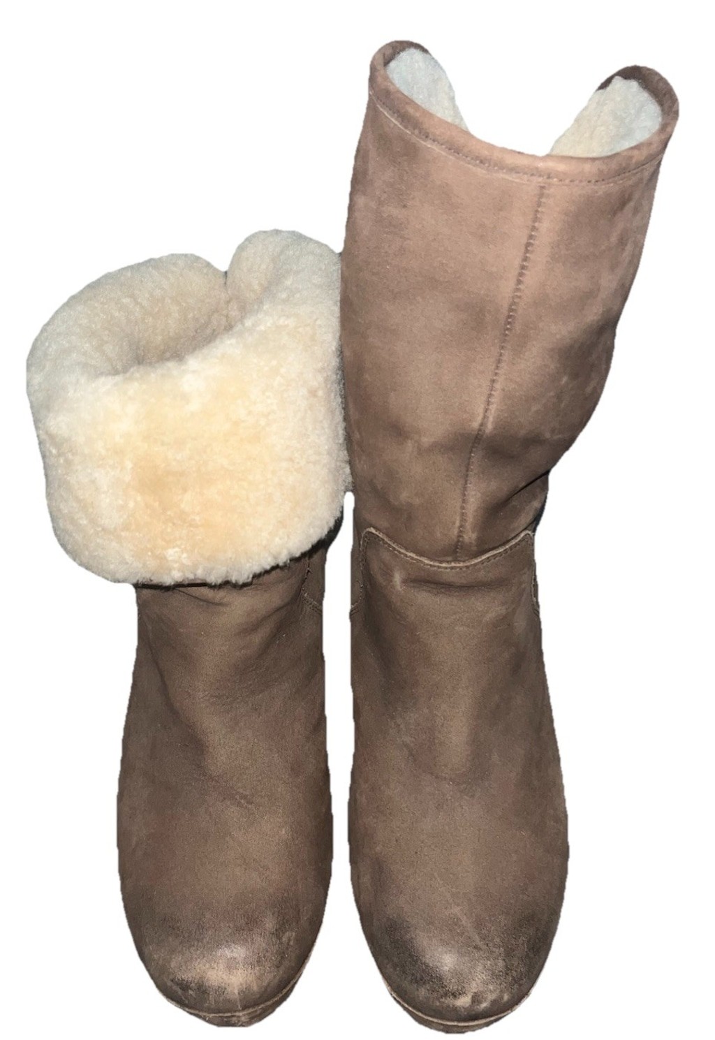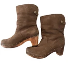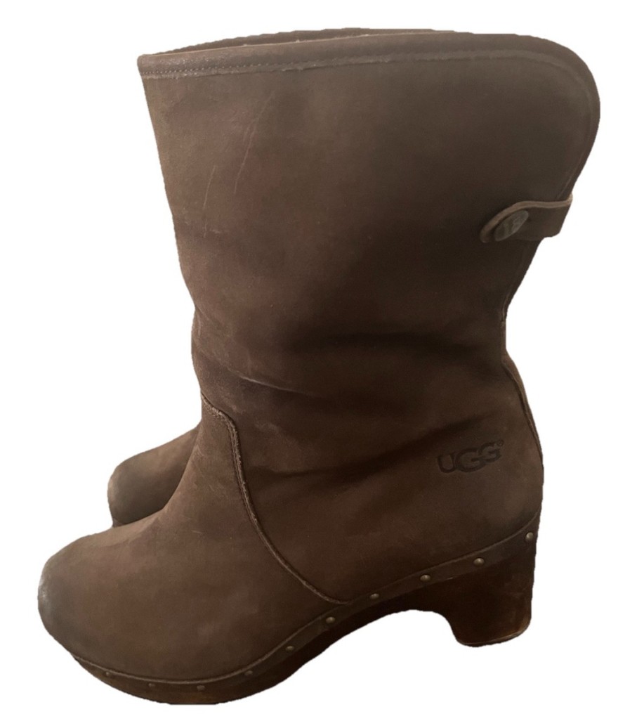 Preloved pair of UGG Women's Lynnea Shearling Ankle Clog Boots Sheepskin Lining USA size 9, Brown Cuffs but can fold up and hit lower calf. Nice quality! Stylish and modern, UGG® Australia Lynnea Boots feature polished leather or rich suede. The pull-on ankle boots dress up with a 2-1/2" wooden heel, rivet detailing and an 8" shaft that can be worn up or down. Cozy sheepskin lining. A great look day or night! UGG® Australia Lynnea Boots Retail was 289$ and they cannot be purchased in the US! In polished leather or suede 2-1/2" wooden heel gives it a sleek look Shaft can be worn up or turned down for two different looks! Minor scuffs on toe and heel but I believe a good cleaning and polish can make them look even better!! Check out my closet for other great items to receive bigger discounts and bundled S/H!