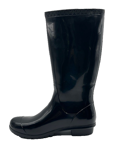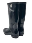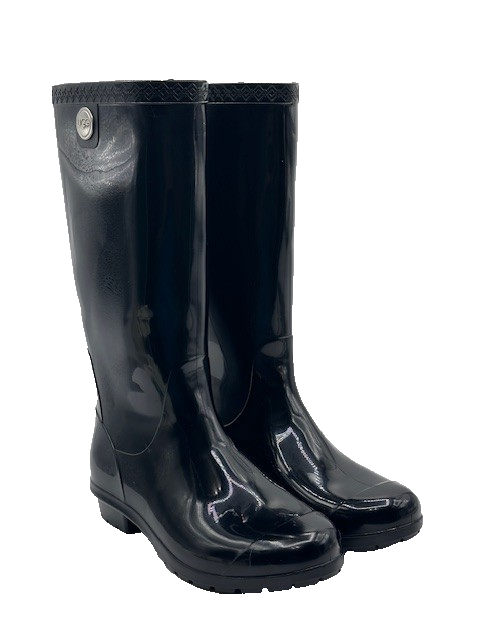 UGG Women’s Shaye Glossy Black Rubber Rain Boots Waterproof Ugg Logo Size 6 New original box not available. Boots have a few minor scratches from being stored out of box. Please see photos. The UGG Women's Shaye Glossy Black Rubber Rain Boots are stylish and practical footwear for women in size 6. With a round toe shape, pull-on closure, and 1-inch block heel, these mid-calf boots are perfect for travel, casual, or business occasions in all seasons. The waterproof rubber outsole and synthetic lining make them ideal for rainy, snowy, or sunny weather. The glossy black color with the UGG logo accent adds a touch of sophistication to these classic Ugg rain boots.These boots are a versatile and fashionable choice for any woman's wardrobe. High Gloss Rubber Boots Shaft Height 12.5 inches Waterproof Textile Lining Non skid outer sole