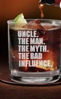 Elevate your drinking experience with this unique Whisky Glass featuring the engraved design of "UNCLE The Man The Myth The Bad Influence". This round-shaped glass is made of high-quality glass and stone material, making it a perfect addition to your glassware collection. This 11 oz capacity glass is designed for adults and is dishwasher safe. It has a modern style and can be used for all occasions. Whether you're celebrating or just enjoying a glass of your favorite whiskey, this glass is perfect gift.So, add a touch of uniqueness to your drinking routine with this engraved Whisky Glass.