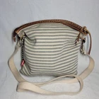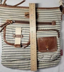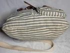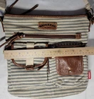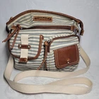 This UNIONBAY Retro 90's/Y2k Vintage Canvas Crossbody Bag features a blue and white striped exterior with faux leather accents. The bag has a distressed finish and a retro theme, making it perfect for travel or casual occasions. It has a zip closure, adjustable crossbody strap, and beige fabric lining. With a medium size and a rectangular shape, this vintage-inspired bag adds a touch of nostalgia to your style. Could use a good cleaning of the canvas materials.