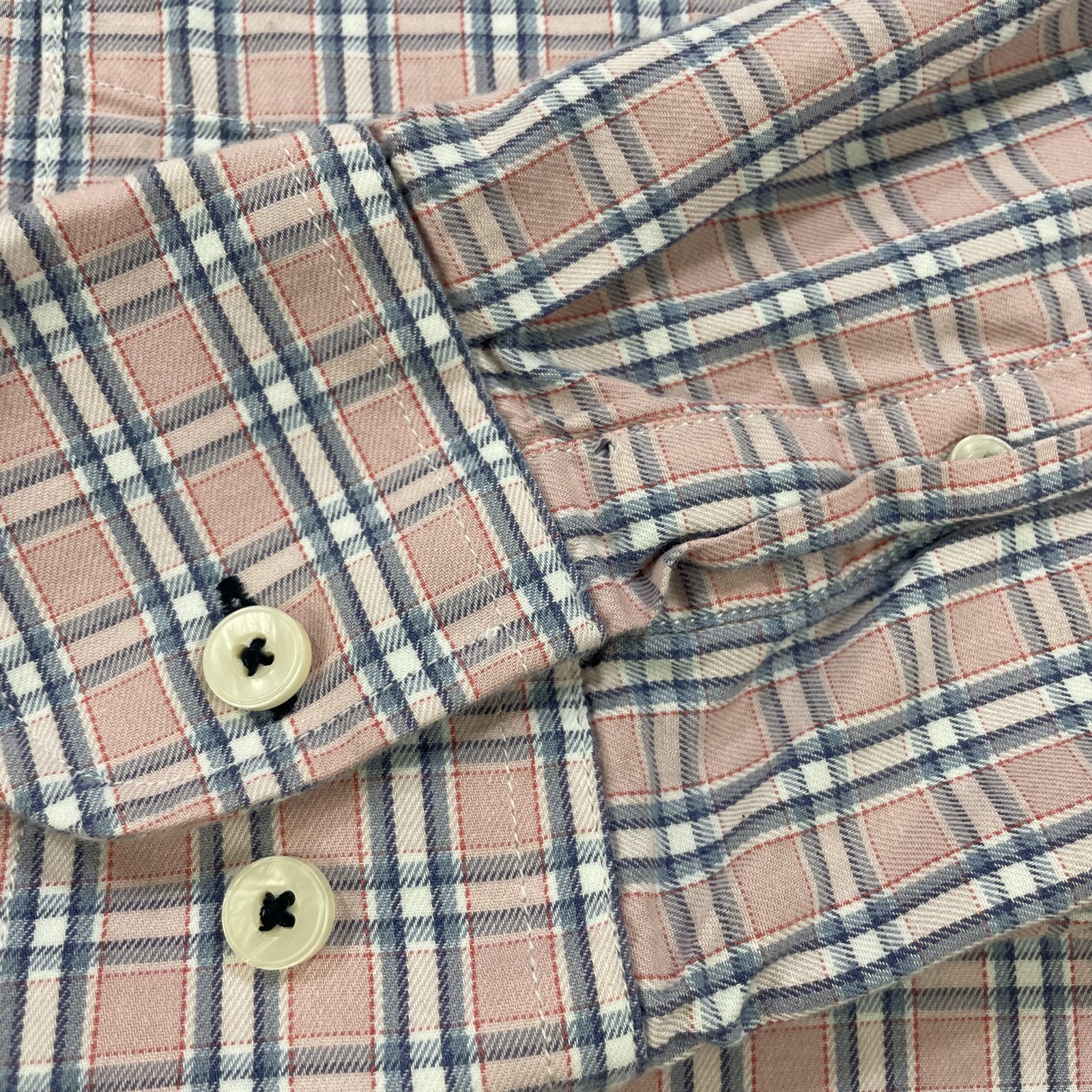 Brand: UNTUCKit Style: Long sleeve button-down collar shirt with front button placket Pattern/Color: Pink and blue plaid check on white Features: Chest pocket, barrel cuffs with double buttons, curved shirttail hem designed for an untucked look Tag Size: Large Material: 70% Cotton, 30% Lyocell Country of Origin: Made in China Brand Tag: UNTUCKit | Est. 2011 Notes: Measurements shown in photos for reference; no UPC/EAN visible on tags