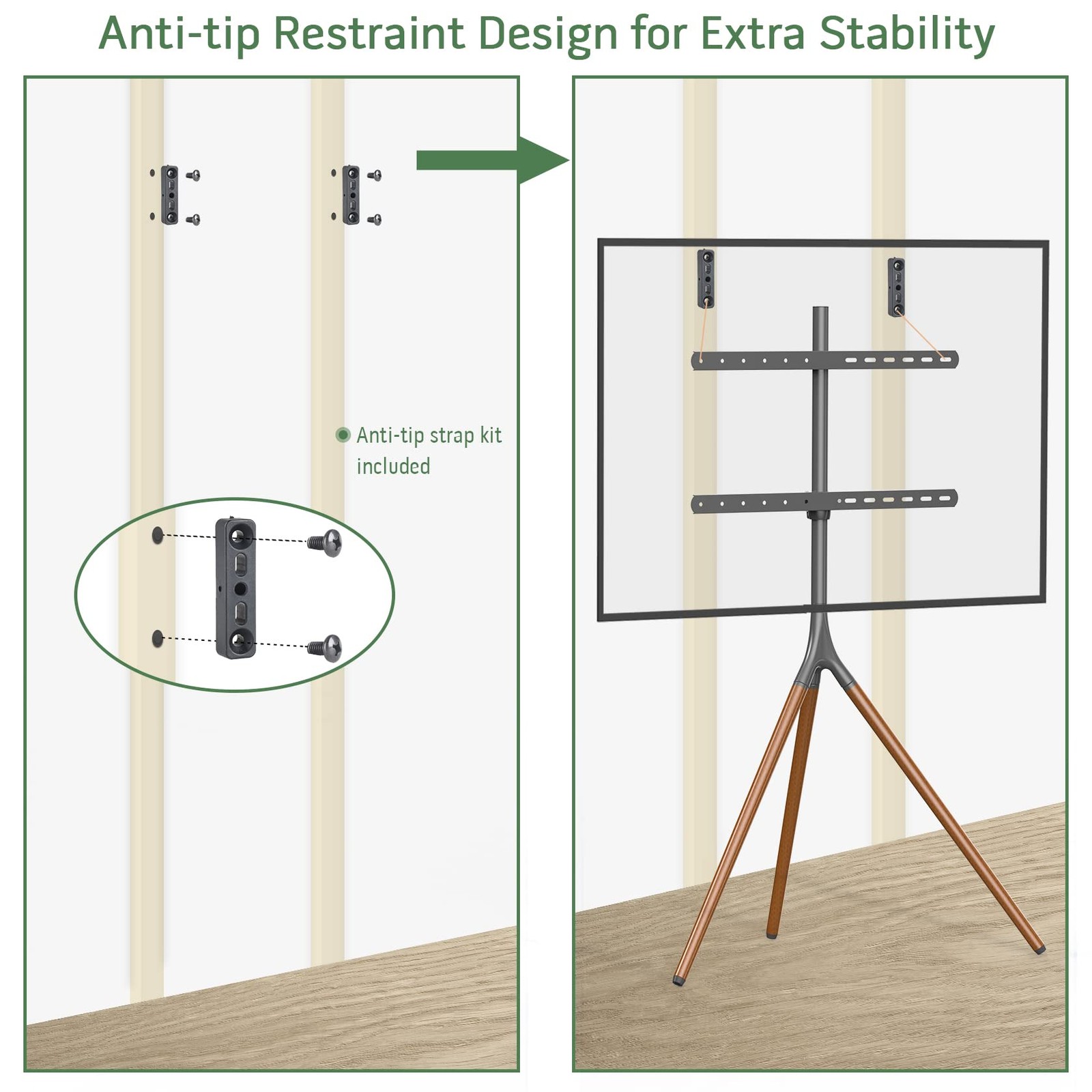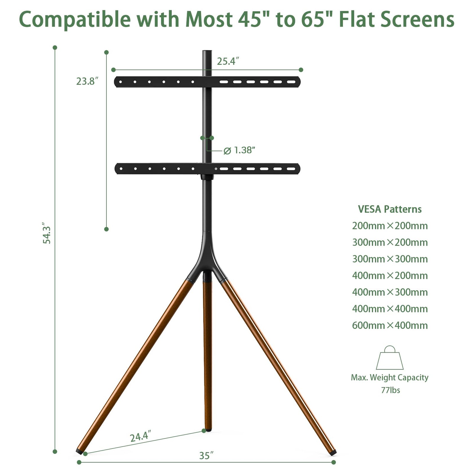 📝 Product Description Wide TV Compatibility: UPGRAVITY easel TV stand fits most 45" 50" 55" 60" 65" LCD LED flat screens weighing up to 77 lbs with VESA patterns 200x200mm, 300x200mm, 300x300mm, 400x200mm, 400x300mm, 400x400mm and 600x400mm. Please confirm the VESA, weight, size specification of your TV before purchasing,Swivel & Height Adjustable: The TV tripod stand features 180°swivel left and right to help you find the optimal viewing angle for all types of TV screen panels. Height adjustment is also provided along the 23.8" center pole by locking the height collar at your desired position,Secure & Stable: Constructed of high quality beechwood with solid tripod legs, this modern TV stand is quite steady and durable. It also comes with anti-tip strap kit to avoid toppling in case of unexpected bump. Anti-scratch rubber feet are designed to protect your carpet and floor,Minimalist, Sleek Design: The low profile TV stand tripod blends well in any room for a cool minimalistic look. Thanks to its chic, slim design, this TV display stand is portable and space-saving, perfect for small apartments, bedroom, living room, patio, office, studio, exhibition hall and more,Easy to Install: Assembly is easy with all the necessary hardware and fixings included in delivery. Cable straps are provided to help organize all the messy wires and cables behind the tripod leg for a neat appearance 📋 Specifications color Black model cg-1964 style modern material Wood itemWeight 13.05 pounds partNumber cg-1964 manufacturer UPGRAVITY productDimensions 10.0 x 5.2 x 35.0 inches ✓ Fast Shipping | ✓ Quality Guaranteed | ✓ Customer Support 30-Day Returns • 100% Satisfaction