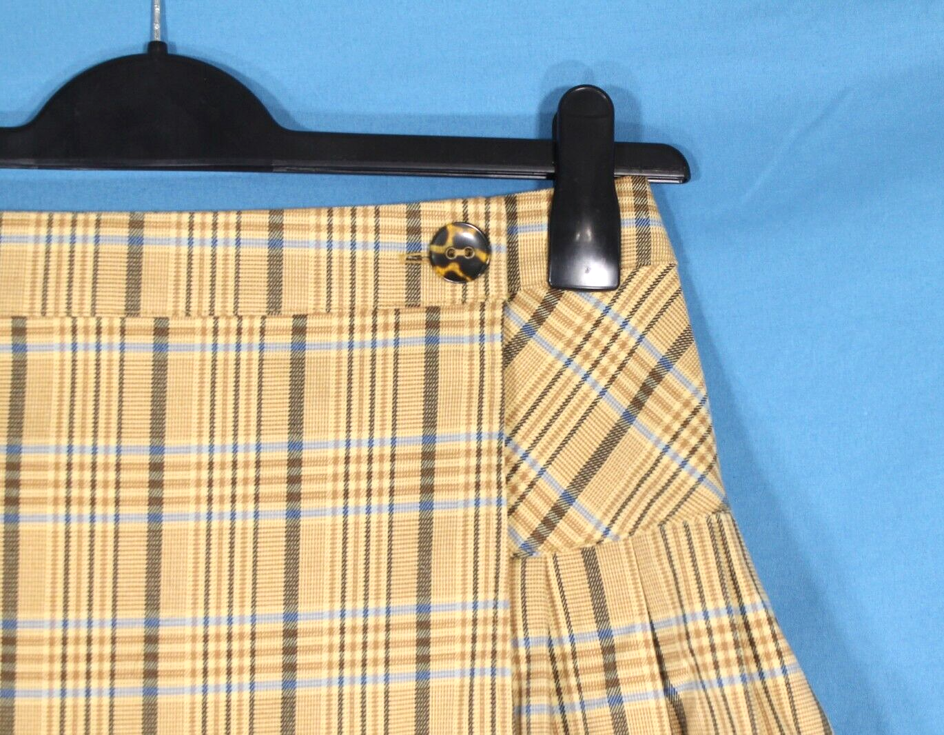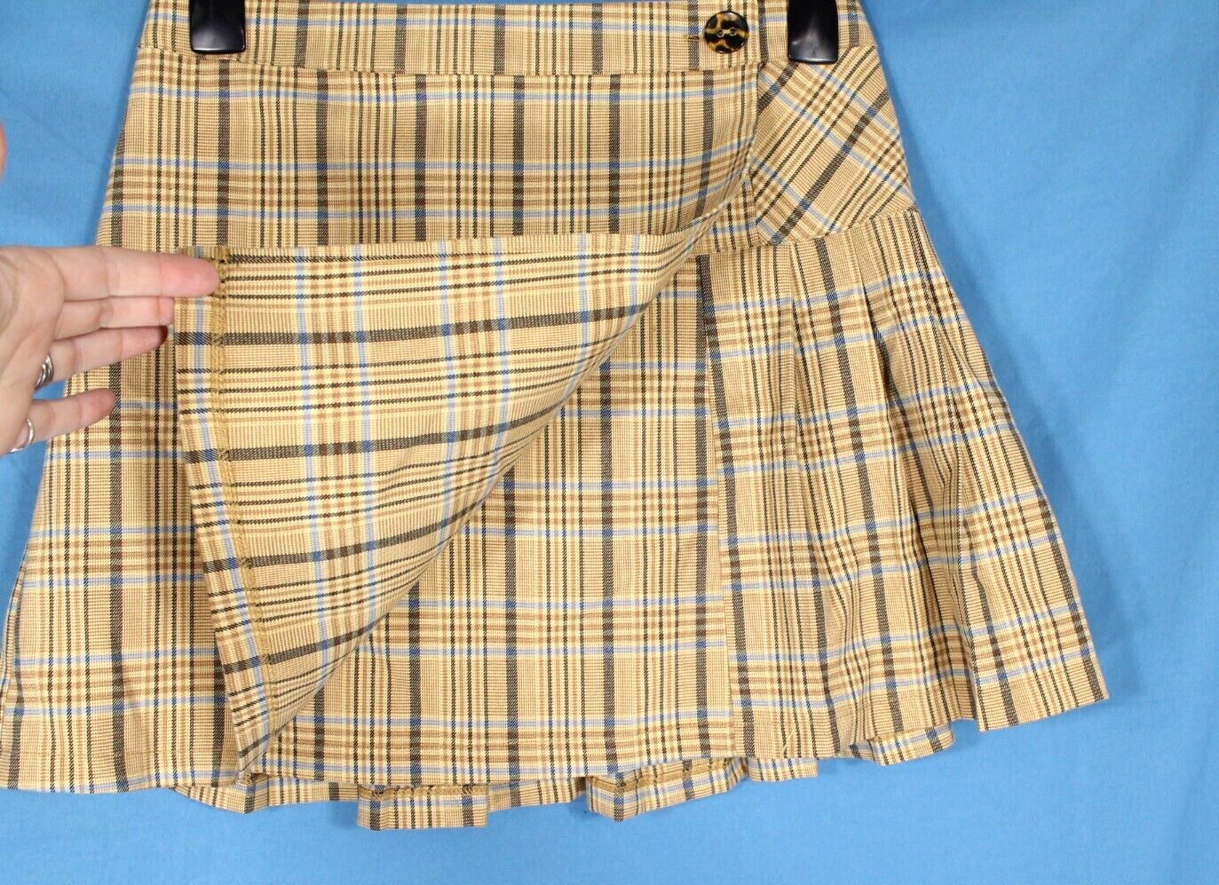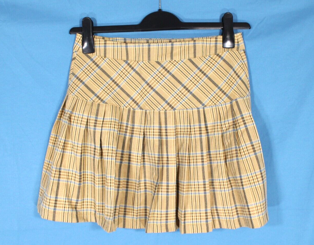 This skirt is absolutely adorable! The gold-brown and blue plaid pattern is so stylish, and the pleated design gives it a fun, preppy vibe. It fits perfectly with a 26" waist and 34" hips, and the 15.5" length is just right for a mini skirt. The fabric blend makes it comfortable with a little stretch, and it’s in great gently used condition. Love how versatile it is—dress it up or down for any occasion! Super happy with this purchase.