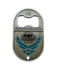 Features: Measures Approximately: 1.25 x 2 inch Edging: No special edging Shape: Dog Tag Shaped Bottle Opener Challenge Coin Front: Mobility Fuel Support Bringing the Force Around the World Reverse: Spanning the Globe Force 76 FMSE ABFDS ORYO
