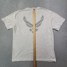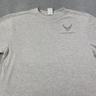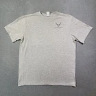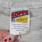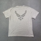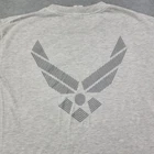 This is a vintage US Air Force Soffe T-shirt in size Large, made in the USA. The shirt is gray with a reflective logo, featuring a crew neck and short sleeves. It is constructed from a blend of polyester and cotton, designed for regular fit. The material is Dri Release for moisture-wicking properties. This military-themed shirt is ideal for men looking for a comfortable and stylish addition to their wardrobe.