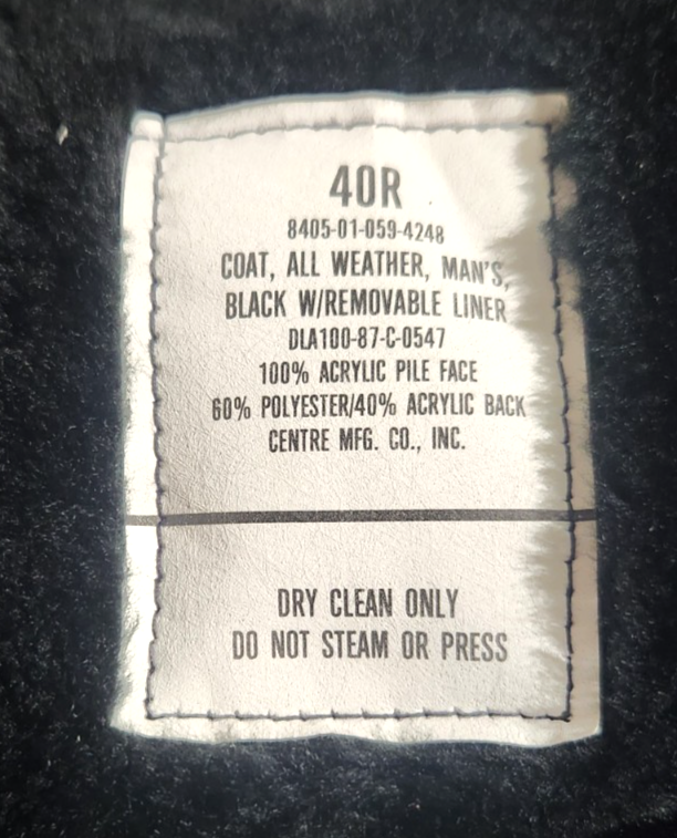 Theme:MilitariaLENGTH:LongSIZE:40RBrand:Centre Mfg CoFeatured Refinements:US Army UniformSeller Notes:“Good used condition. No holes. Had one set of Captains Bars on shoulder which left a mark, NO BELT”ISSUED TO:US ARMYOriginal/Reproduction:OriginalCountry/Region of Manufacture:United StatesITEM:US MILITARY COAT ALL WEATHER, RAIN, TRENCH COATCOLOR:BLACKFABRIC:60% POLYESTER / 40% ACRYLIC
