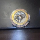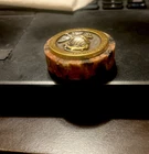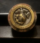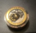 The object is a United States Marine Corps Challenge Coin mounted to a stone with a felt bottom. Challenge coins are traditionally given to members of the military to recognize special achievements, visits, or as a symbol of unit pride and camaraderie. The coin features the Eagle, Globe, and Anchor emblem, the official symbol of the U.S. Marine Corps. Text on the coin reads "United States Marine Corps". Challenge coins are often carried by service members and can be "challenged" in certain situations, with specific rules varying among units. Modern challenge coins may also feature popular culture or organizational values. Commemorative coins such as this one may be produced in limited quantities. Challenge coins have a tradition of being presented for exceptional service or achievement. If someone drops a challenge coin, everyone present must produce theirs or buy a round of drinks. Symbolism: These items, whether challenge coins or conchos, represent honor, bravery, and achievement. Etiquette: Civilians can own and use challenge coins, but should respect the traditions and etiquette associated with them.