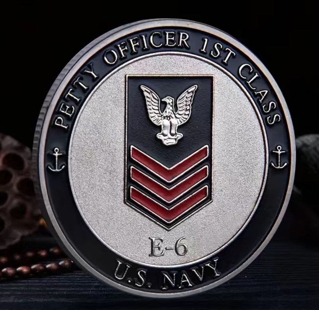 U.S. NAVY COIN: E6 PETTY OFFICER FIRST CLASS. Brand New! High Quality Colorized and High Relief Finish. You will receive one Challenge Coin. Photo depicts front and rear of coin. Fast shipping from USA...High Quality items. Dimensions 1 3/4 inch (40mm). With protective case. USPS First Class Shipping with Tracking. Ships within 24-48 hours from ordering. Perfect gift!