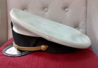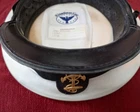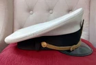 Measurements: 7-1/4 (22-3/4" / 58cm) Medium Poor condition. Parts of sweatband degraded and missing. D egradation on visor rim. Band was over-stretched and has been repaired by folding. Includes chin strap, device and buttons. No size stamp nor manufacturers date. Identification tag below label marked 'Midn (Midshipman) Hightower, 182622, L-21'. Manufactured by Kingform Cap Co , USA. Likely 1990's.