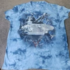 Soft and durable cotton T-shirt featuring a detailed graphic of a US Navy aircraft carrier and fighter jets. Stylish tie-dye design. • 100% Cotton • Tie-Dye Design • US Navy Aircraft Carrier Graphic • Short Sleeve • Crew Neck Top to bottom = 27 inches