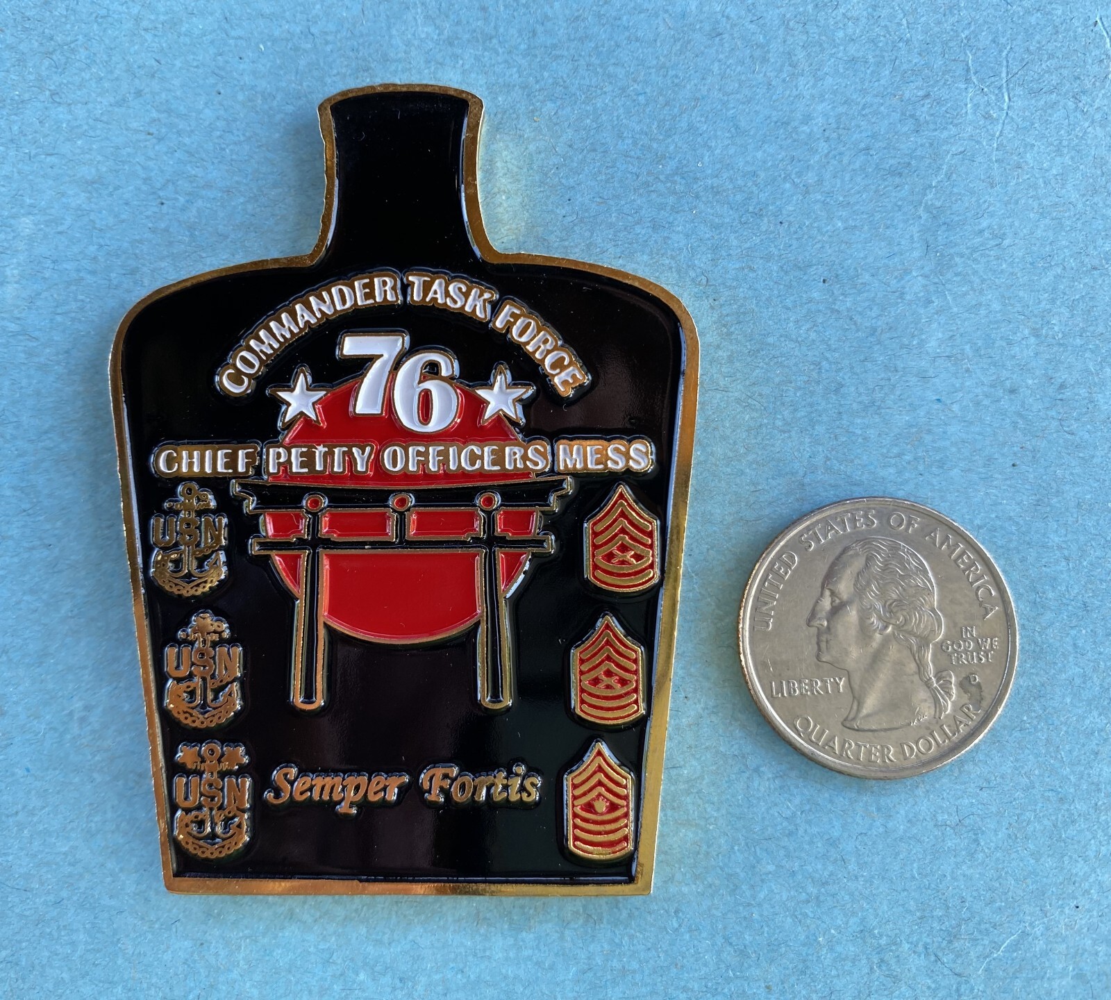 COMMANDER TASK FORCE 76 (CTF-76) CHEIF PETTY OFFICER (CPO) coin. Pre-owned "used" but in great condition. See coin for reference. Coin is not included in sale. Please look closely for possible edge wear, surface wear, scuffs, scratches , scrapes, dings, chips, dents, divots, bent, color loss, enamel loss, oxidation, patina, soiling, or corrosion. The pictures are part of the description. The images you see are actual pictures of the item taken by me - I do not use stock, borrowed, or internet pictures. What you see is what you'll get. Coin is maintained in a vinyl protective case and only removed to take pictures. Comes from a smoke and pet free environment. This coin was personally acquired by me during my 28 year US Naval career and will be a great addition to your collection. I will carefully package and ship the day after purchase/payment received via USPS First Class Mail unless it falls on a Friday, Saturday, Sunday, or holiday in which case I will ship on the following business day. Tracking information will be provided via eBay. I don't gouge on shipping. If you buy two coins on the same day, I'll combine the shipping fees and upgrade you to USPS Priority Flat Rate Box. If you buy 3 or more coins, shipping will still upgrade to USPS Priority and I'll refund the difference. I will only ship to the United States or FPO/APO addresses. Please contact me if you have any questions regarding this item before you bid or buy. Thank you for looking.