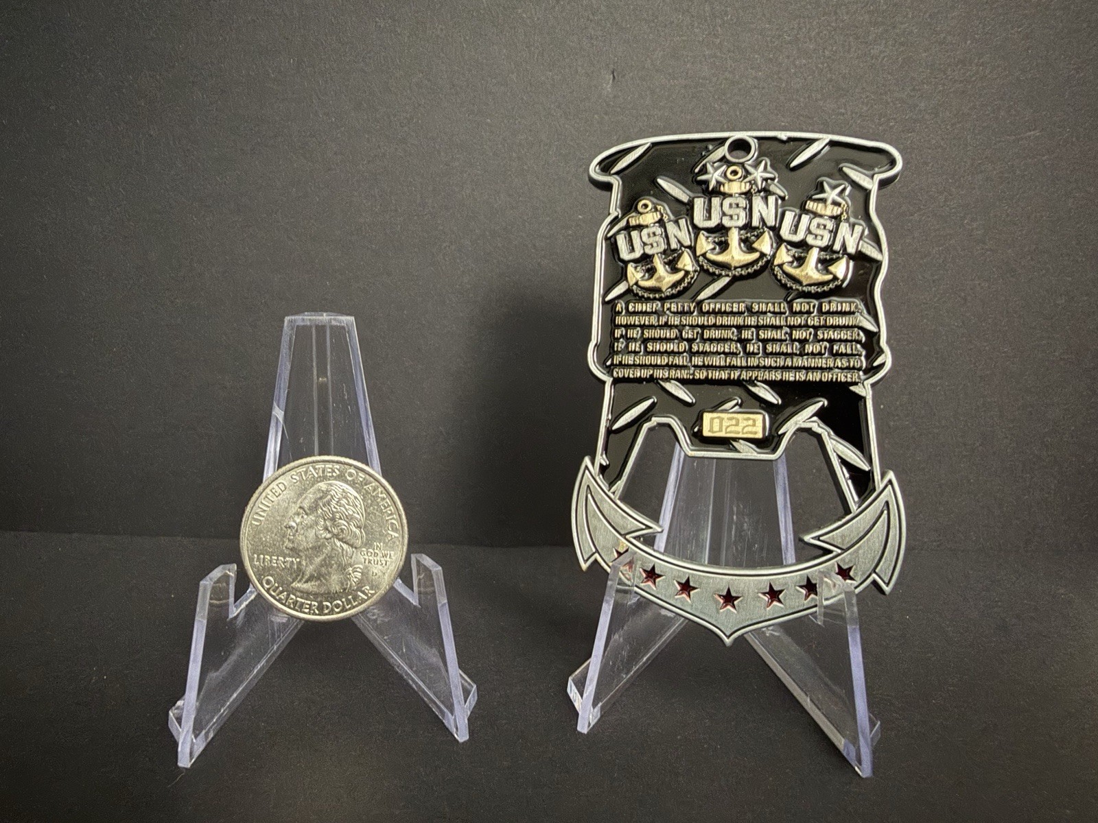 This serialized US Navy Chief Petty Officer Challenge Coin, featuring a theme of militaría, states how a Chief Petty Officer shall not drink. It is a unique collectible item that holds significance for military personnel and collectors alike. This coin would make a thoughtful and patriotic gift for someone in the military or a civilian who appreciates military history and tradition. It also serves as a bottle opener and serialized with 022.