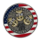 US Navy Deckplate Leadership Challenge Coin Features: Measures Approximately: 2 inch (51mm) Diameter Edging: Flat Cut Edging Shape: Round Challenge Coin Front: Deckplate Leadership Reverse: We Either Find A Way Or Make One Respect Character Loyalty