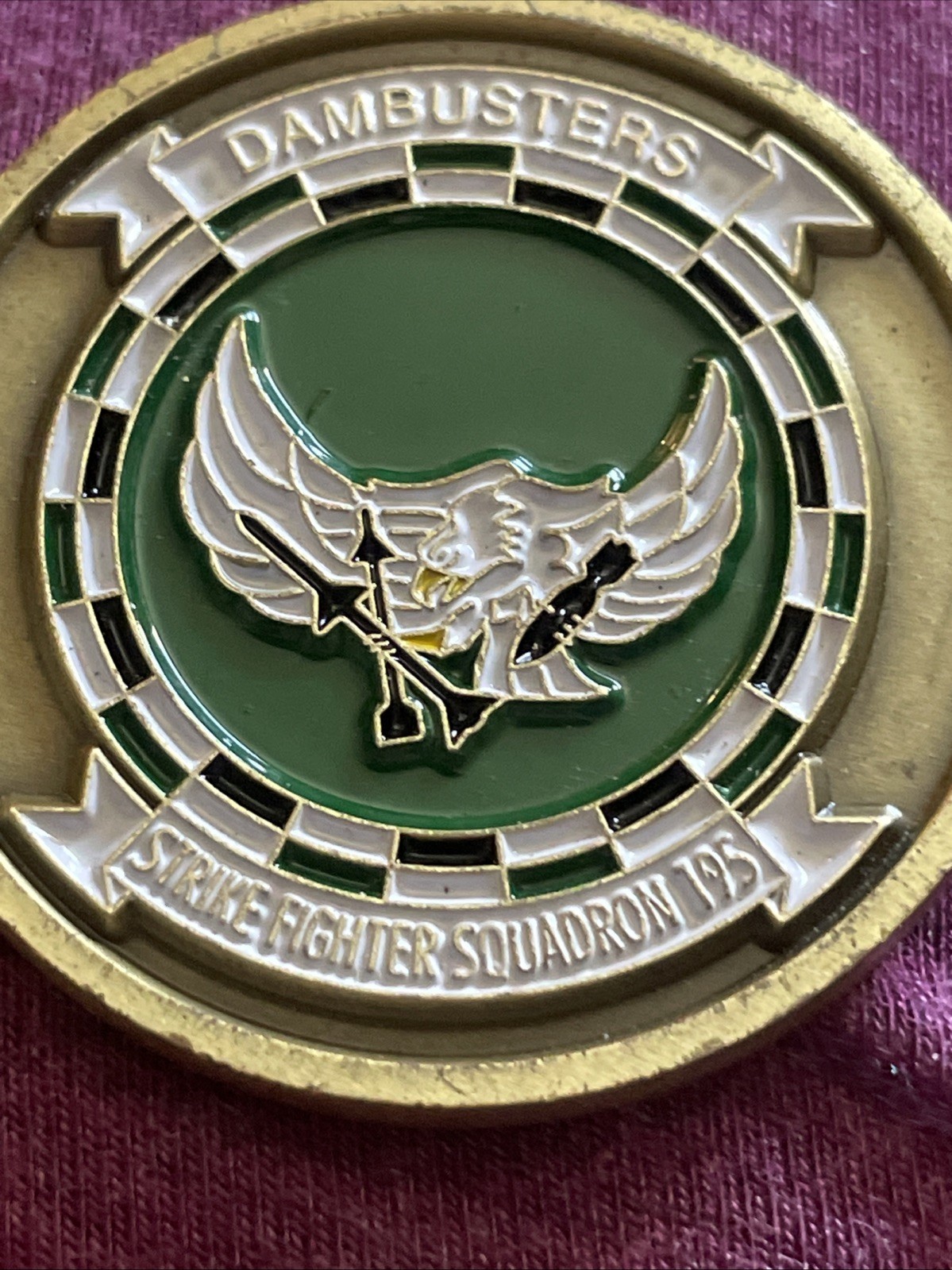 This United States Navy challenge coin belongs to the Strike Fighter Squadron DAMBUSTERS (VFA-195). It is an original item that was manufactured in the United States and features the theme of Militaria. The coin is a part of the US Navy Challenge Coin collection and was made during the time period of 2001-Now. The challenge coin is an original and has not been modified. It is a collectible item that falls under the category of Current Militaria (2001-Now) and Original Items. This coin is a great addition to any collection and would make a perfect gift for anyone interested in the United States Navy. This challenge coin is in pretty decent condition. It does have a bit of some wear and some minor tarnish. Shipping USPS ground