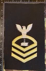 Here is a United States Navy rating or rank badge / patch for Steelworker Chief Petty Officer Patch. USN SWC, Seabee, multi-piece construction gold embroidered chevrons and silver embroidered eagle and specialty mark on blue or black material. This patch appears to be new, old stock (NOS). Excellent condition, see photos.