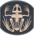 US Navy Seals Frog Skeleton Badge/Shield shaped patch is 2.75 by 2.9 inches 3-D patch rubber qvc 2.0 sturdy, heavy, solid patch. built to last entire patch is cast in rubber pvc 2.0 light tan raised 3-d skeleton of the frog is partially embedded and sits atop the textured black background. trim is grey and is raised.
