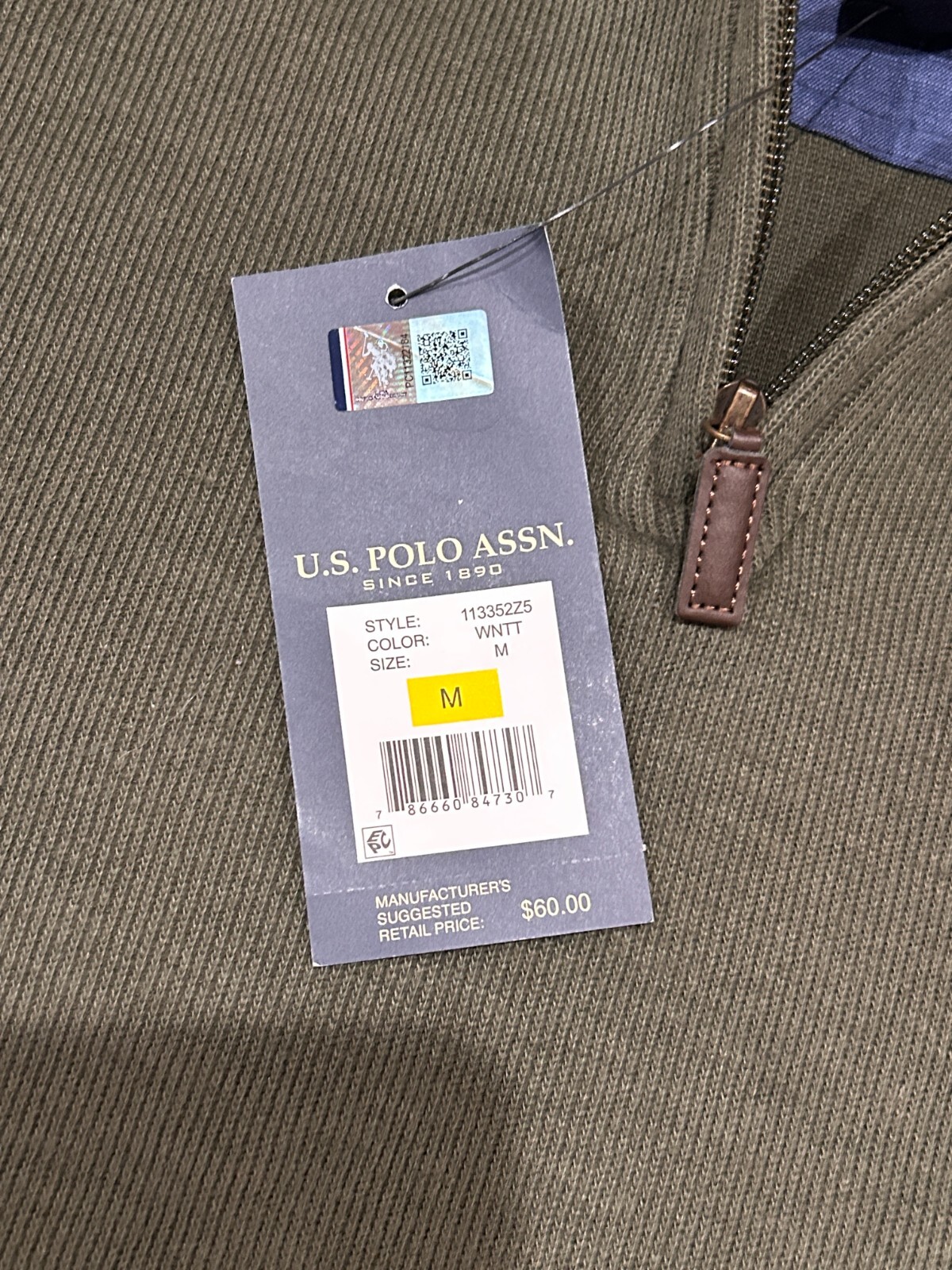 Item Description Upgrade your wardrobe with this U.S. Polo Assn. Men’s Quarter Zip Pullover Sweater. Featuring a timeless olive green color and a classic mock neck, this versatile piece is perfect for casual, business-casual, or layered looks. Crafted from a soft, breathable knit cotton blend, it delivers comfort, style, and durability in one. The quarter-zip front offers easy on-and-off and lets you adjust for comfort or layering. Features • Brand: U.S. Polo Assn. • Style: Quarter Zip Pullover Sweater • Neckline: Mock Neck • Color: Olive Green • Size: Men’s Medium (Regular Fit) • Material: Cotton Blend Knit (soft & breathable) • Condition: New with Tags (NWT) • Embroidered logo on chest • Great for layering, casual wear, or business casual