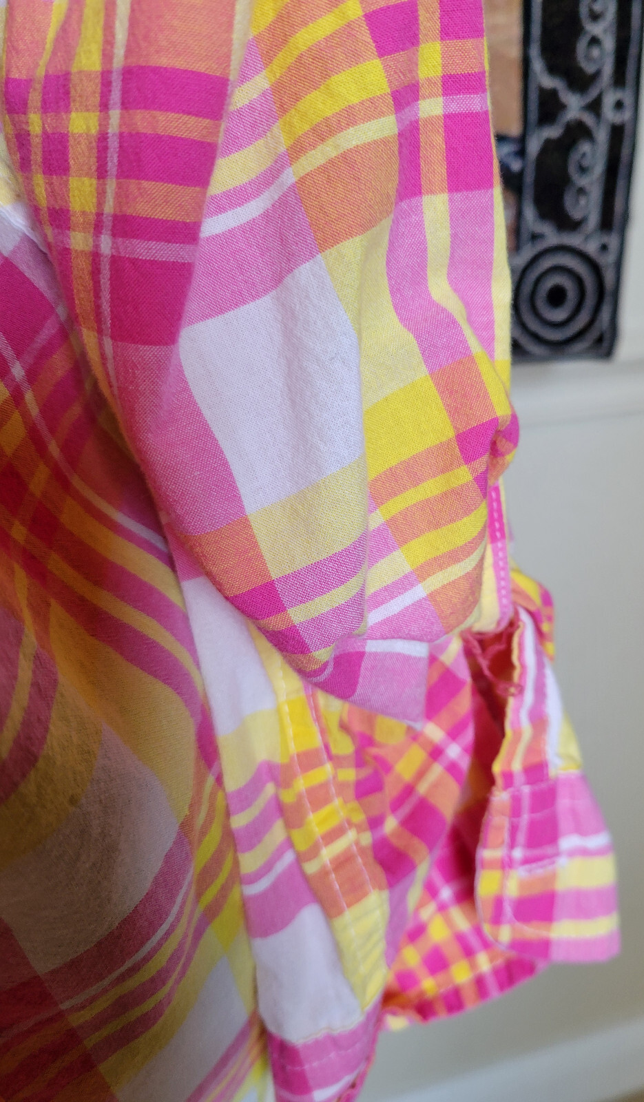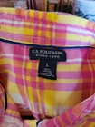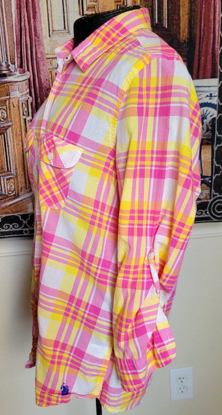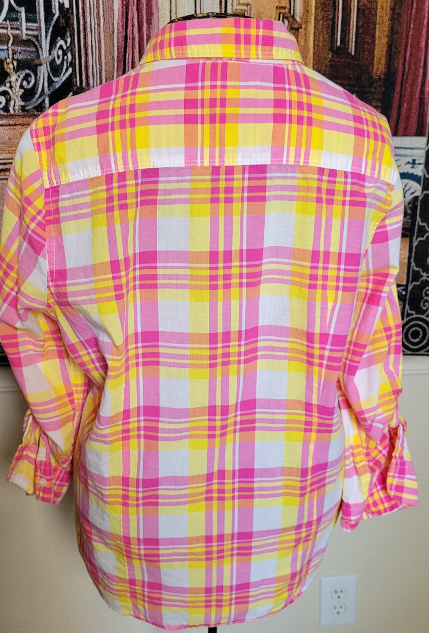 Cute and colorful semi-sheer cotton shirt with a collar, button-up closure, two breast pockets, an embroidered blue logo near the hem, and buttoned roll-tab sleeves that can worn at half length to 3/4 length. Bright pink and yellow plaid stripes on white. Great for Easter or the spring season. Lightweight and unlined. 100% cotton. Machine wash cold. Measurements (lying flat) Shoulder to shoulder: 15" Armpit to armpit/chest: 20" Length (shoulder to hem): 23" Sleeve length: 18"