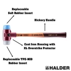 "The Simplex Mallet is the signature hammer in the line. This patented hammer has a "split housing' design that is made from heavy duty cast iron. This split housing allows it to be take apart and the components can be replaced when worn or damaged. It solidly locks in the variety of replaceable insert faces. The faces are made of several different durable materials; from soft rubber to medium hard plastic to hard nylon. also offers aluminum and copper faces for hitting very hard surfaces such as hardened steel (copper faces are only with Simplex with reinforced cast iron housing; for details). SIMPLEX soft-face mallet with the insert combination of TPE-soft (blue, soft, no marring) / TPE-mid (grey, medium hard, no marring). Cast iron housing with integrated handle protection sleeve and excellent break resistance. High-quality, vibration-damping, and ergonomically shaped wooden handle; grip area with double coat of varnish (resistant to dirt). All parts can be replaced / retrofitted, resulting in great savings in cost and resources. Available in sizes of D30mm to D60mm.