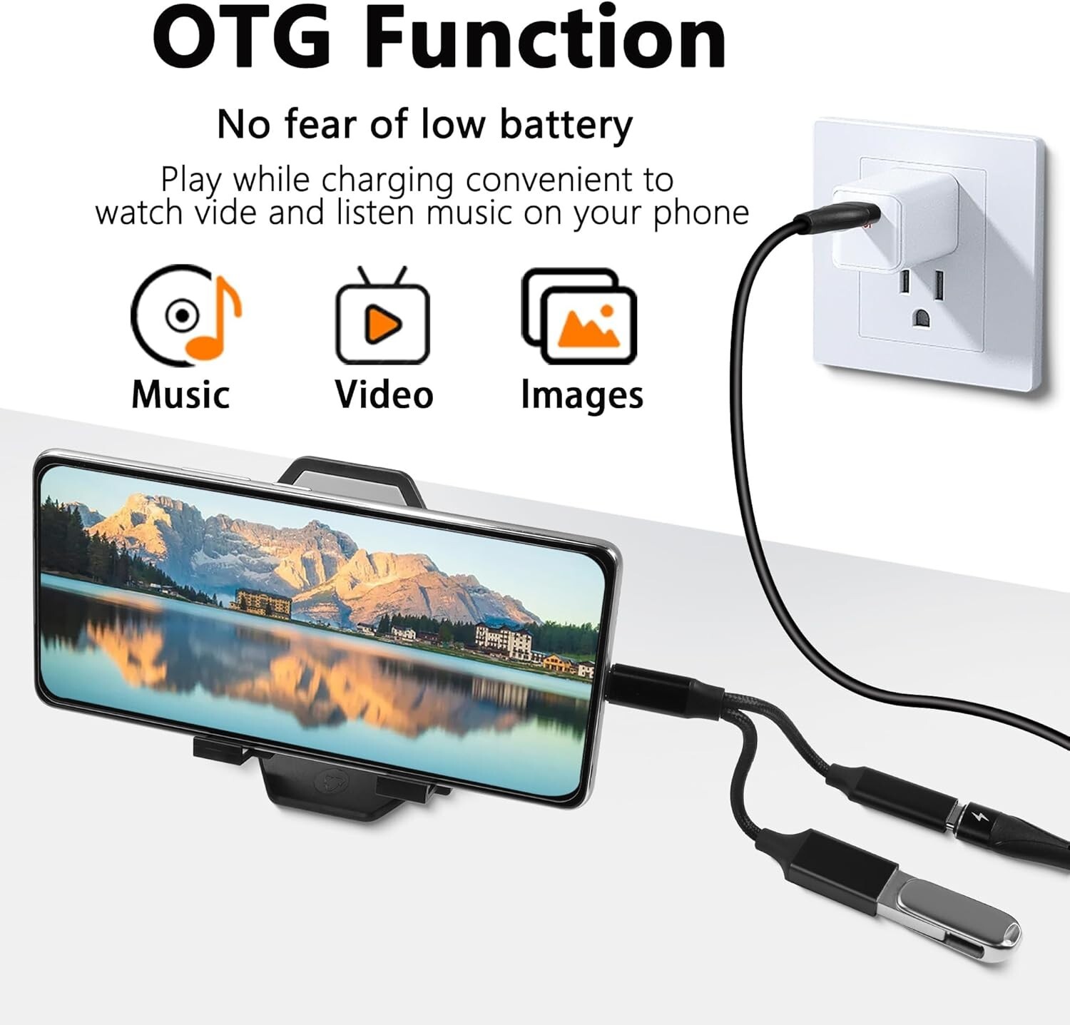 GELRHONR USB C OTG Charging Adapter, 2 in 1 Type-C Splitter With 10W Charging and USB A Female Port, Short Extension Cable for Most Type-C Phones, Fan, Printer (Black) About this item ✪ USB C splitter 1 in 2 out: This USB C OTG Adapter splitter with usb port and a usb c port. Allows you to connect two devices to a different USB port at the same time. USB C female support 5V/2A charging, USB A female support data transfer. ✪ Support data transfer and charging: This 2 in 1 charging OTG adapter splitter cable with usb c female and usb a female. It can provide data transfer speeds of up to 480 Mbps and also supports up to 1.5 Amps of power output. ✪ Note: This Type-C 2.0 Y Splitter Charging Cable CANNOT charging IOS devices. And not work for car audio, Andriod Auto or A*p*ple Carplay. As these systems do not support USB hubs. ✪ Plug and play: There is no additional drivers or software installation required. You can simply plug it in your device and start using it.An easy way to extends your USB connection to the computer or laptop.
