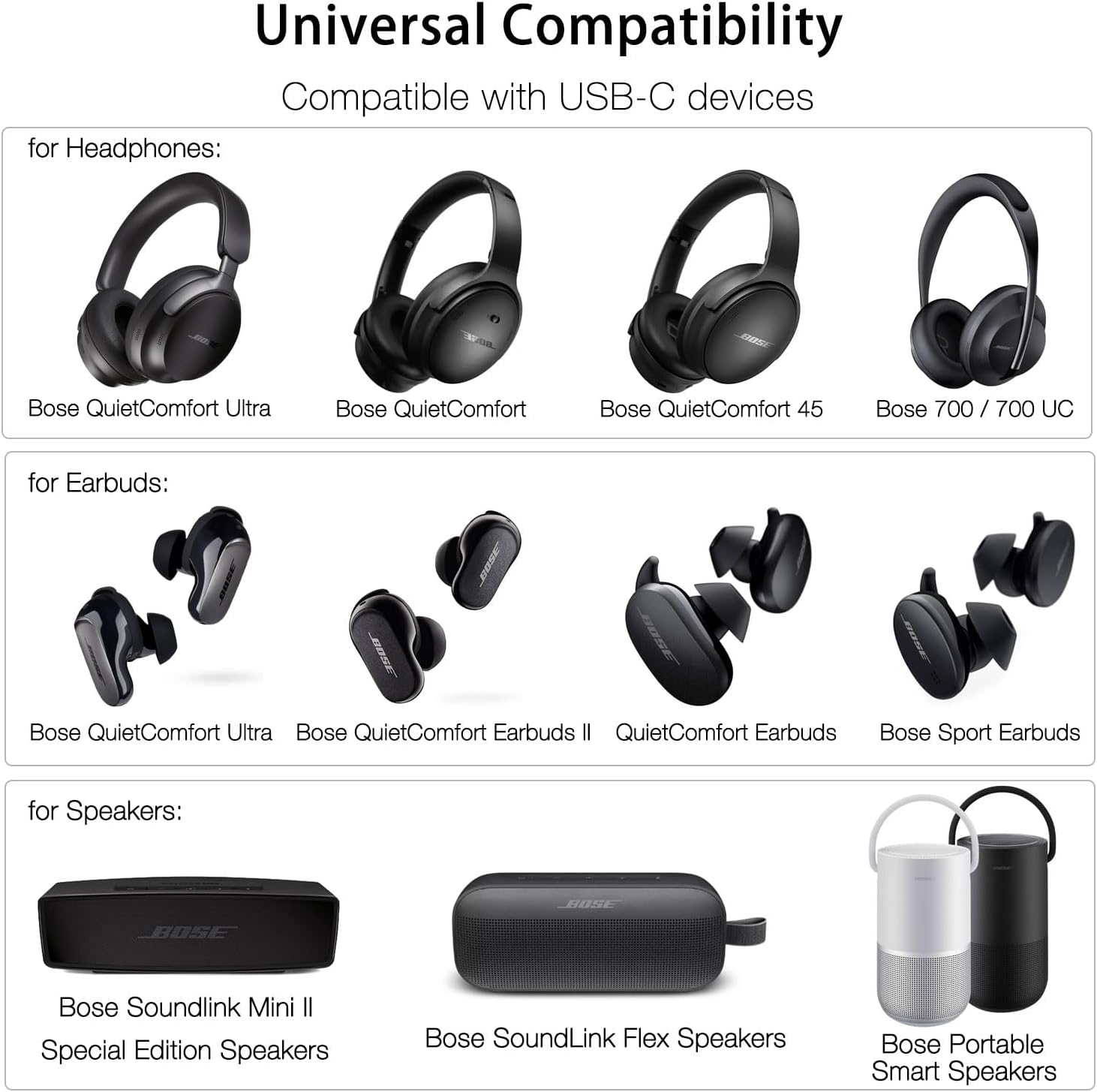 Fit for New Bose QuietComfort Ultra, SoundLink Mini II(Special Edition), Bose 700, 700ANC, QC45, Sport Earbuds, SleepBuds 2, Portable Smart Speaker, QuietComfort Earbuds, QuietComfort Earbuds II, SoundLink Flex Comprehensive Protection: Charger matches the current as your device needs automatically. Multi-function protection technology makes it safe enough to ensure that this USB C charger and your device are safer to charge at night Color: Black, Length: 5ft, Package included: 1* Cable & 1*Power Adapter Dear friends, if you are not sure what interface charging cable your bose uses, you can contact customer service to answer for you For Bose Wireless Noise Cancelling Headphones/Speaker Charger Cable. Quickly charge Bose Bluetooth Speaker without damaging the battery. Compatibility: Headphones Model: New Bose QuietComfort Ultra Headphones; Bose Noise Headphones 700; Bose Noise Headphones 700 UC; Bose QuietComfort Headphones; Bose QuietComfort 45 Headphones; Earbuds Model: New Bose QuietComfort Ultra Earbuds; Bose QuietComfort Earbuds; Bose QuietComfort Earbuds II; Bose Sport Earbuds; Speakers Model: Bose Soundlink Mini II Special Edition Speakers; Bose SoundLink Flex Speakers; Bose Portable Smart Speakers; Color: White Cable Length: 5Feet (59in / 1.5m) What You Get: 1 x USB Type C cable; 1 x 5V2A Power Adapter And if there are any problems with products, contact our professional and responsible customer service!
